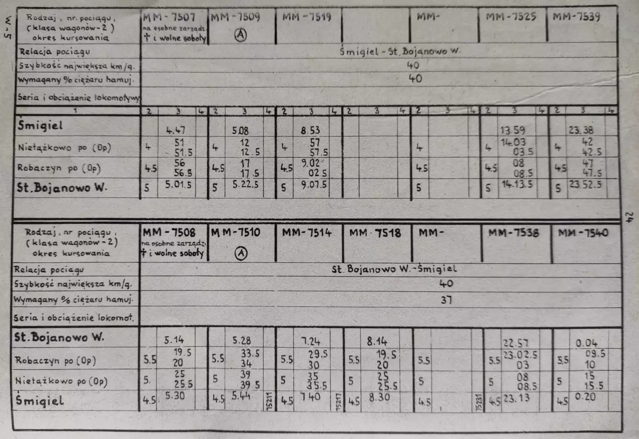 Pociągi pasażerskie na odcinku Śmigiel - Stare Bojanowo Wąskotorowe, skan ze Służbowego Rozkładu Jazdy Pociągów Pasażerskich i Towarowych - zeszyt VII-W-5, strona 24 (RJ 1990/1991).