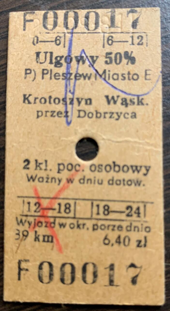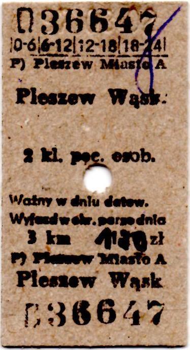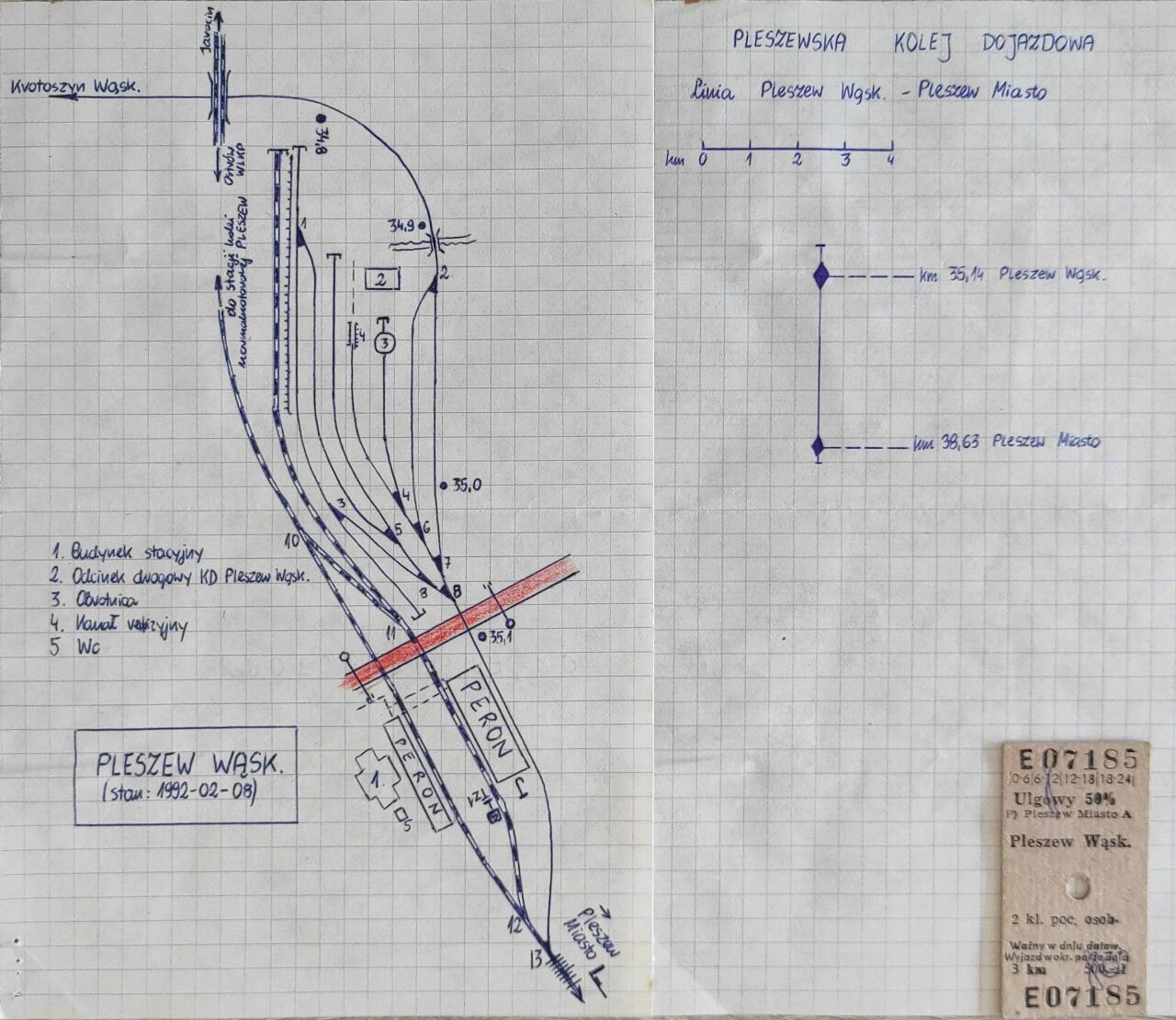 Schematy uproszczone: stacja Pleszew Wąskotorowy, linia Pleszew Wąskotorowy - Pleszew Miasto. Stan na dzień 8 luty 1992 rok. Bilet kartonowy wydany w 1992 roku w kasie biletowej stacji Pleszew Miasto.