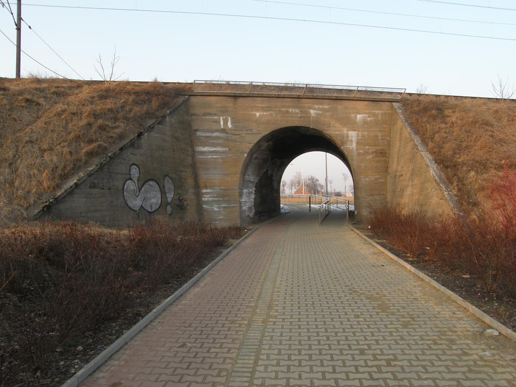 Dwa wiadukty jednoprzęsłowe nad przejściem pieszym (dawniej koleją wąskotorową). Wiadukt z dwoma torami szlakowymi linii Ostrów Wielkopolski - Leszno. W prawo Ostrów Wielkopolski, w lewo Leszno. 163,8 km/ 1,4 km.