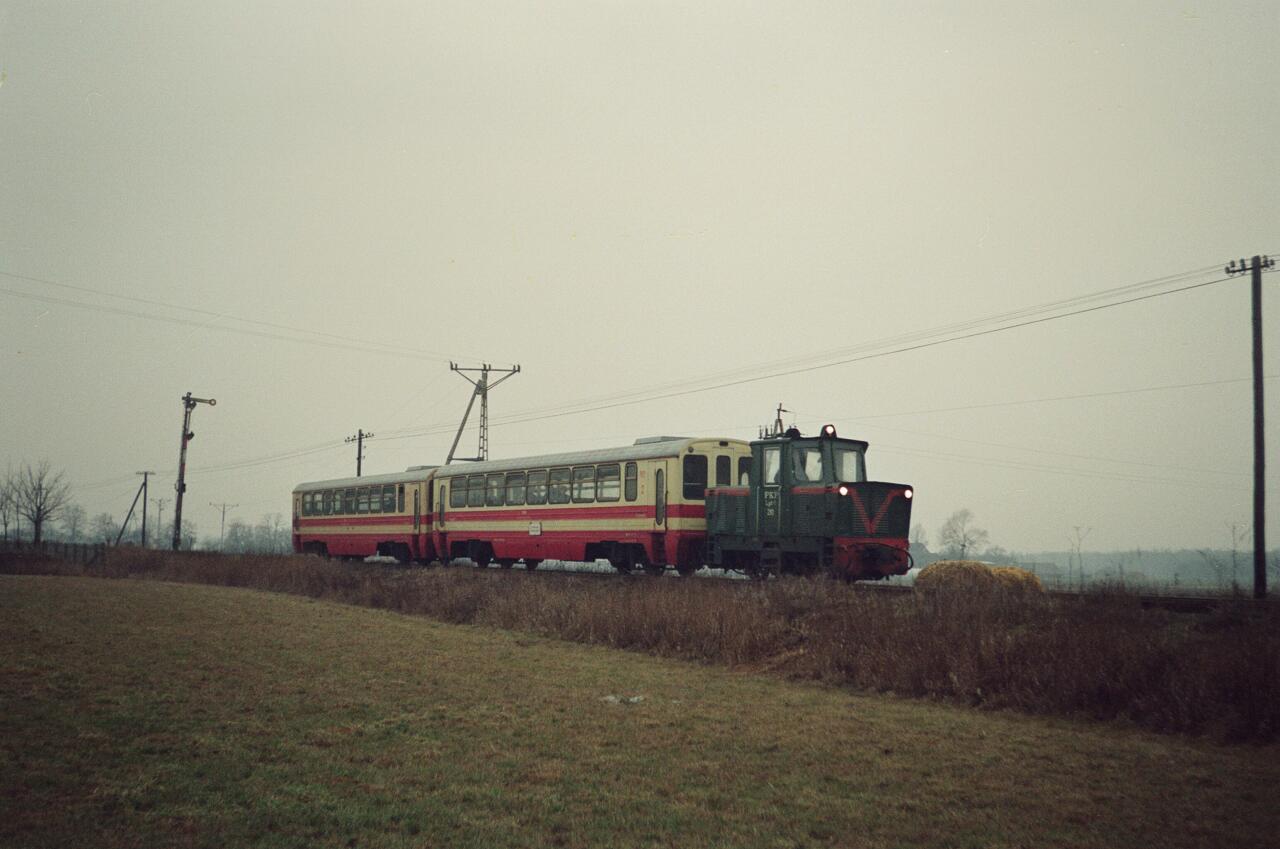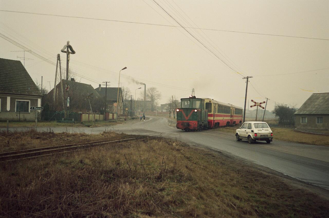 Szlak Pleszew Wąsk. - Pleszew Miasto: pociąg MS 7415 relacji Pleszew Wąsk. - Pleszew Miasto prowadzony lokomotywą Lyd1-210. Z lewej strony widoczny semafor wjazdowy stacji Pleszew Wąsk.