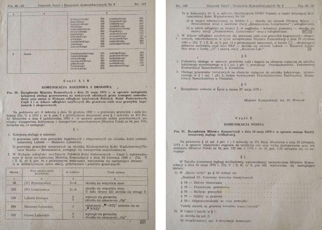 Zarządzenie Ministra Komunikacji dotyczące zawieszenia przewozów pasażerskich na linii Lębork - Maszewo Lęborskie, zawieszenia przewozów towarowych na odcinku Pleszew Miasto - Broniszewice (pozycja 50).