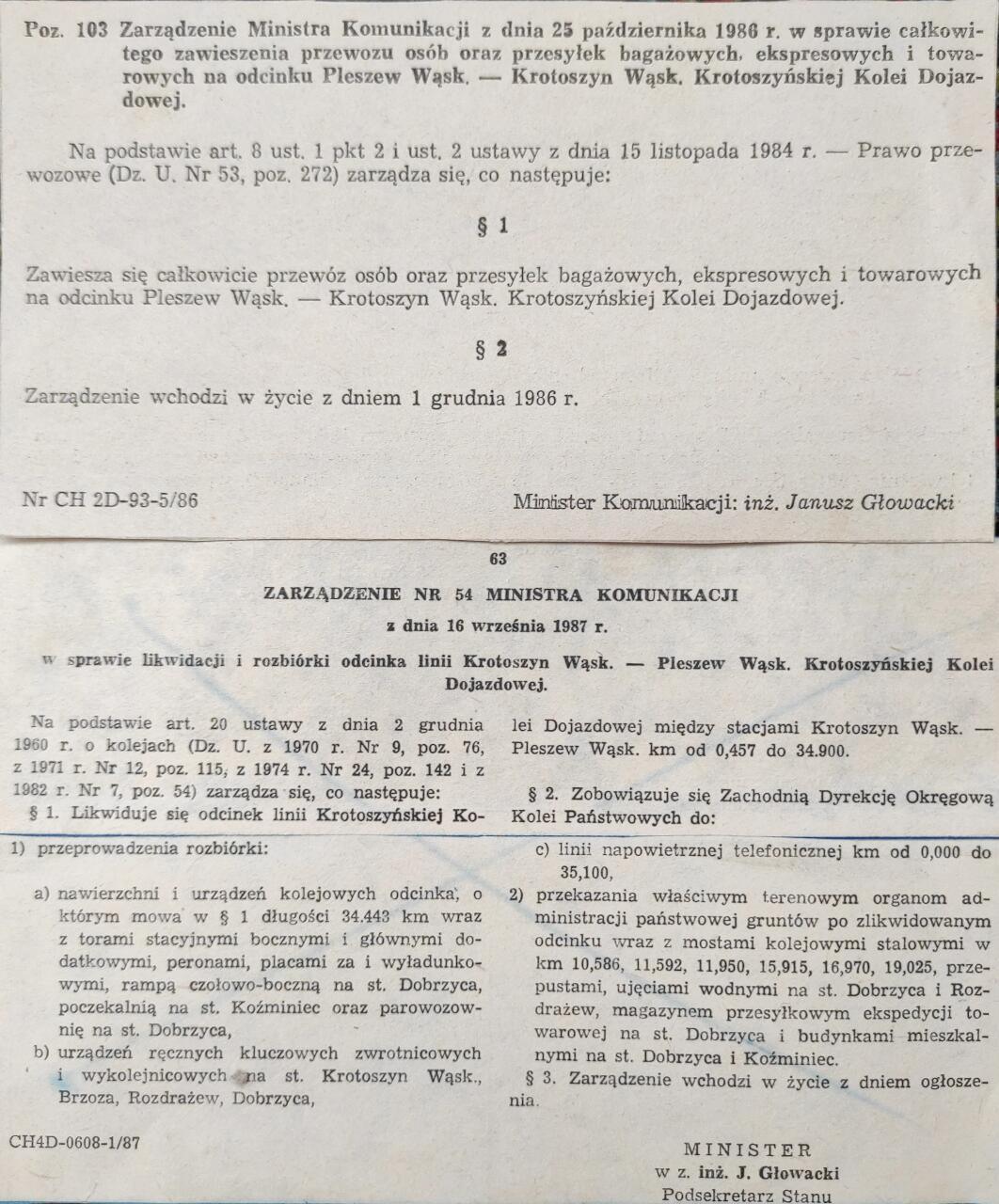 Zarządzenie Ministra Komunikacji dotyczące zawieszenia przewozów pasażerskich i towarowych na odcinku Krotoszyn Wąskotorowy - Pleszew Wąskotorowy (pozycja 103), Zarządzenie Ministra Komunikacji dotyczące likwidacji i rozbiórki odcinka Krotoszyn Wąskotorowy - Pleszew Wąskotorowy (pozycja 63).