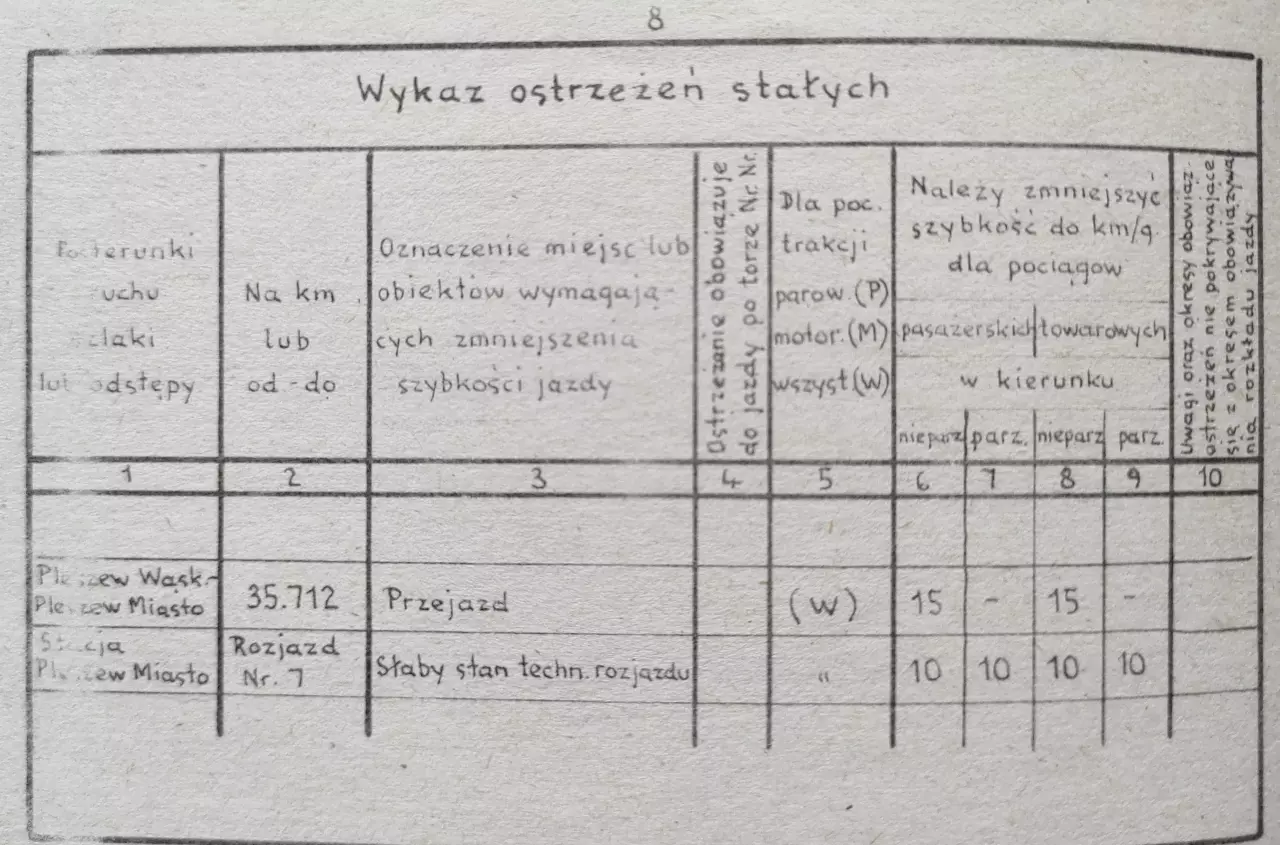 Wykaz ostrzeżeń stałych Krotoszyńskiej Kolei Dojazdowej, skan ze Służbowego Rozkładu Jazdy Pociągów Pasażerskich i Towarowych - zeszyt VII-W-4 (RJ 1990/1991).