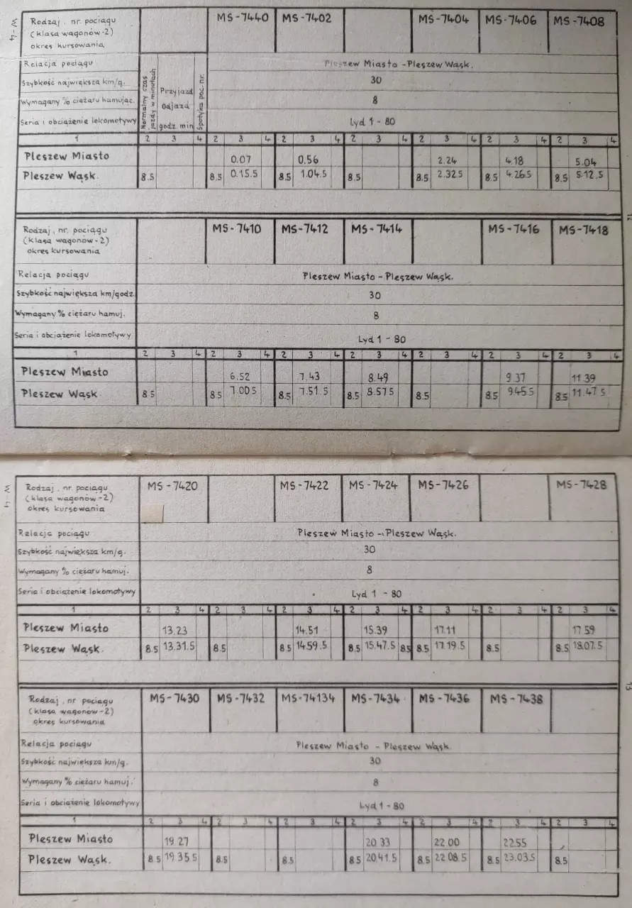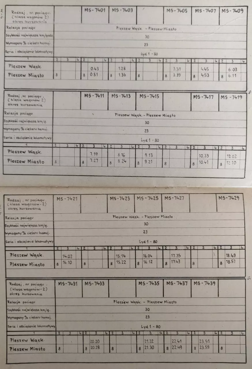 Pociągi pasażerskie relacji Pleszew Miasto - Pleszew Wąskotorowy, skan ze Służbowego Rozkładu Jazdy Pociągów Pasażerskich i Towarowych - zeszyt VII-W-4, strony 12-13 (RJ 1990/1991).