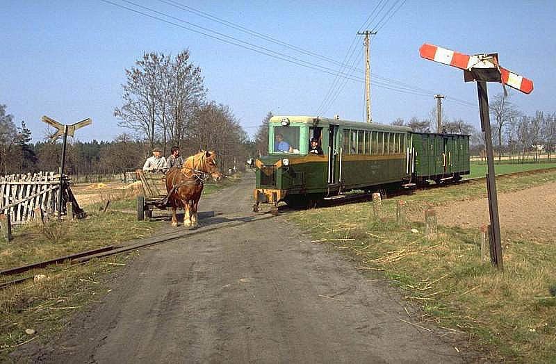 „Ryjaczek” na przejeździe. Jak widać, spotkanie z kolejką już wtedy było totalnym zaskoczeniem, nawet dla miejscowych. (foto ze strony www.bahnbilder.de).