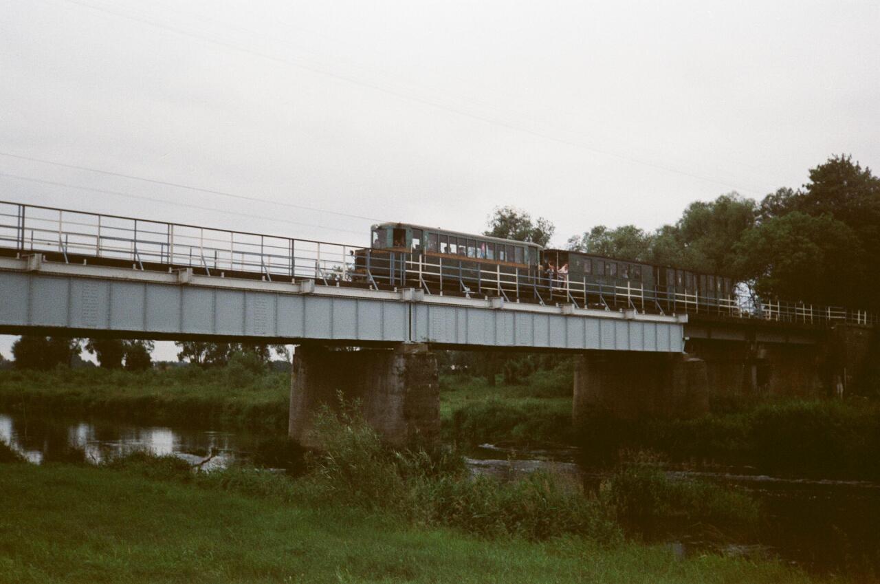 Pociąg specjalny MM 01 "Pożegnanie Kolejki Witaszyckiej" relacji Witaszyce Wąskotorowe - Zagórów, prowadzony wagonem spalinowym MBxc1-41 na moście na rzece Prosna (km 20,595 - 20,678 linii Witaszyce Wąskotorowe - Zagórów). Widok w kierunku stacji Witaszyce Wąskotorowe.