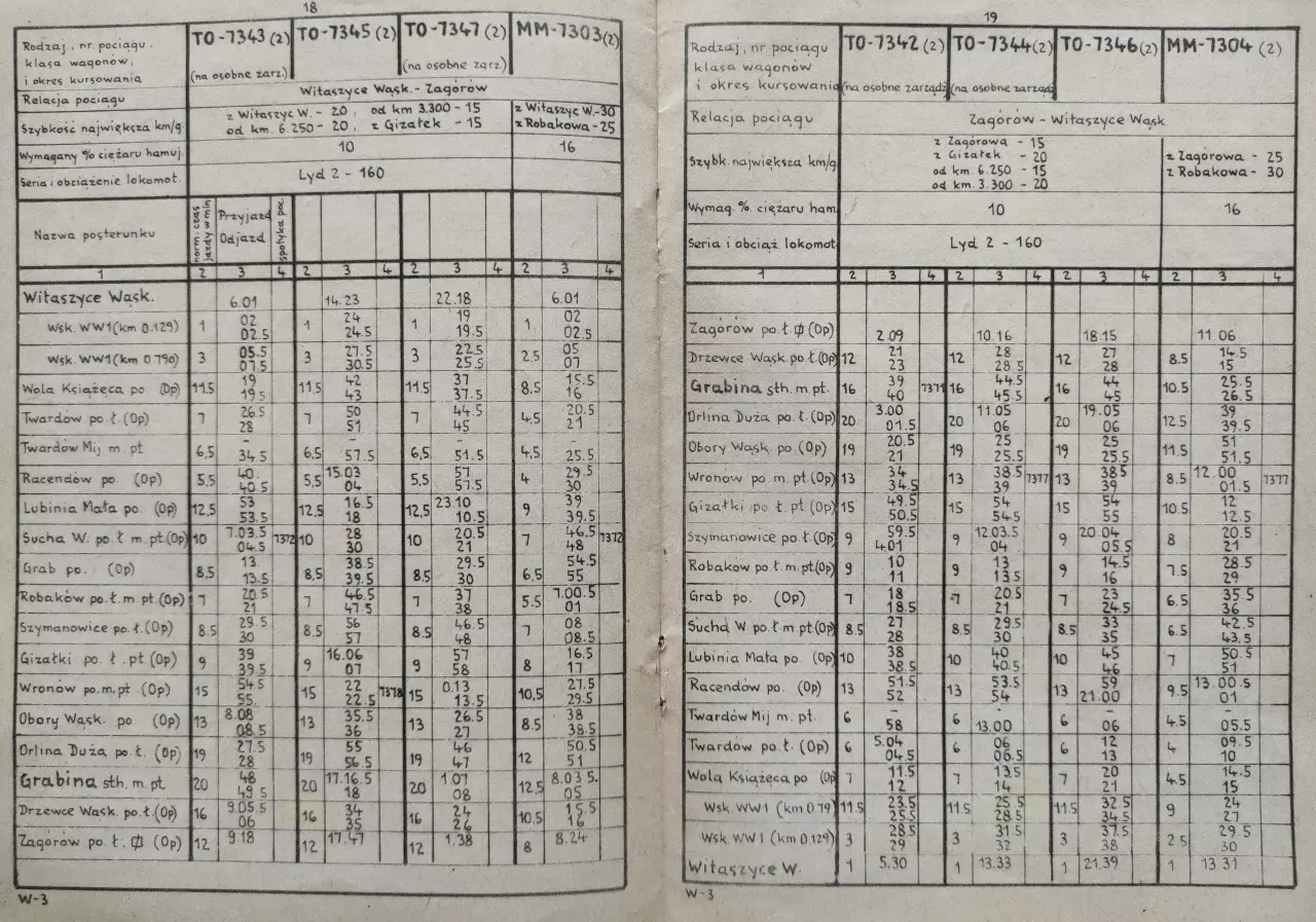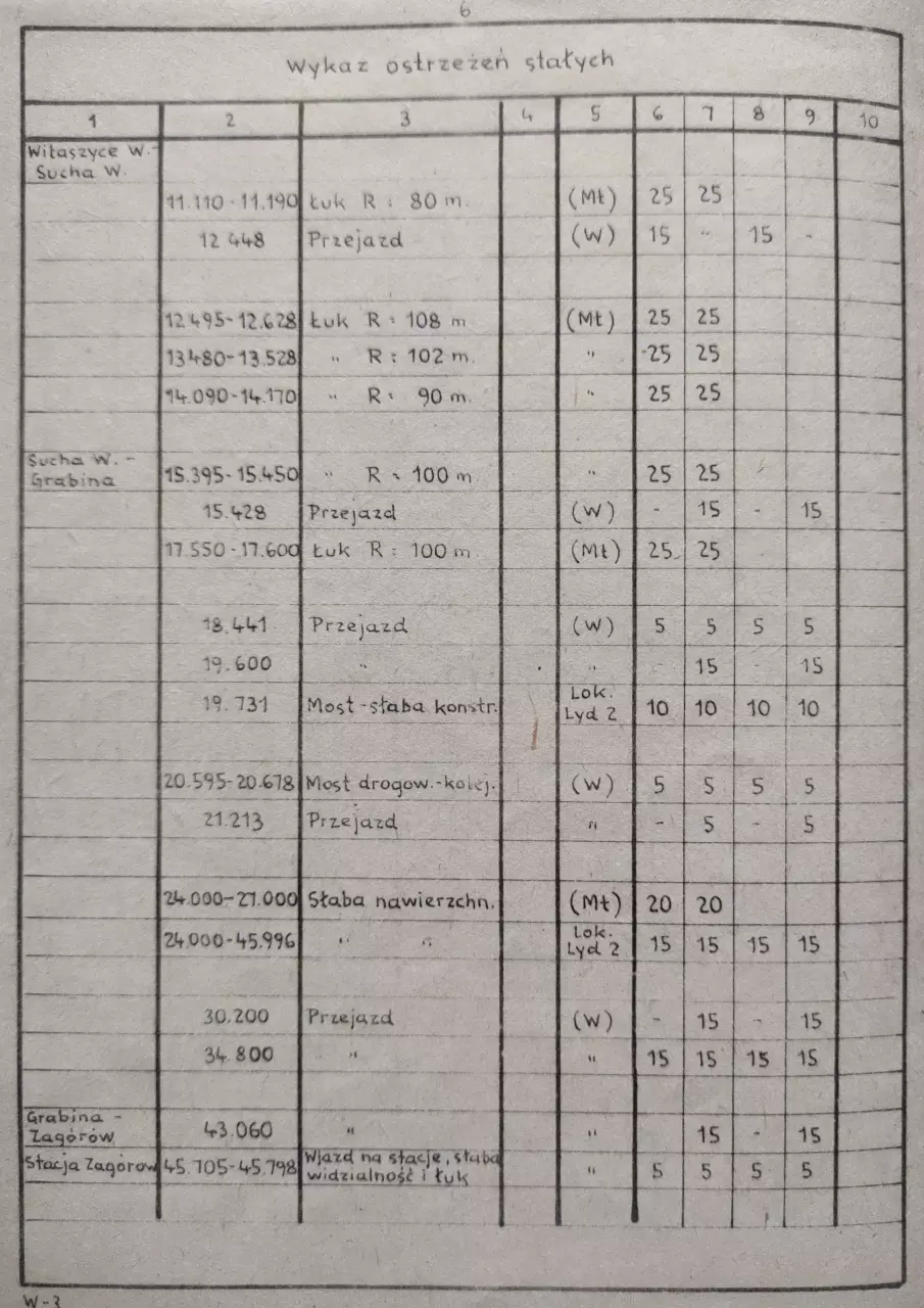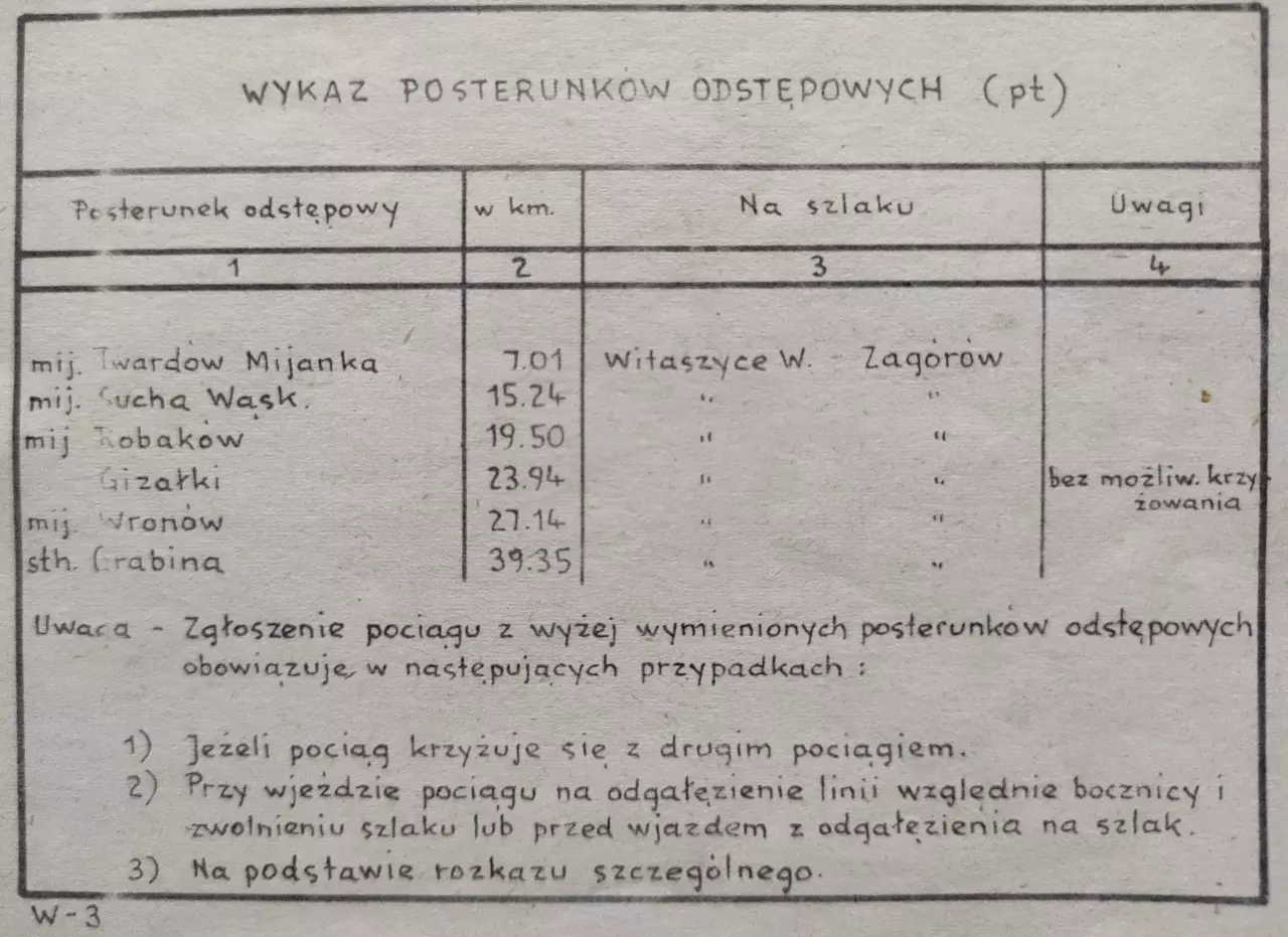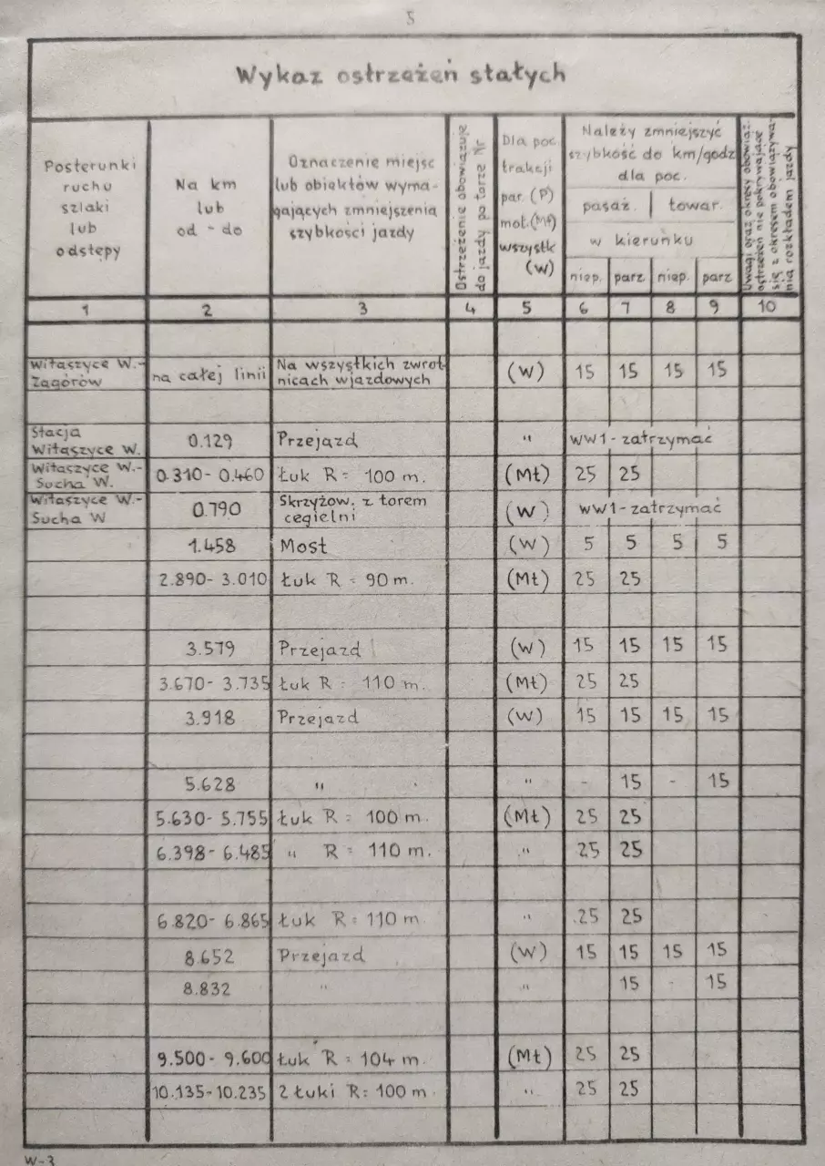 Wykaz ostrzeżeń stałych Jarocińskiej Kolei Dojazdowej: odcinek Witaszyce Wąskotorowe - km 10,235 linii Witaszyce Wąskotorowe - Zagórów, skan ze służbowego Rozkładu Jazdy Pociągów Pasażerskich i Towarowych - zeszyt VII-W-3 (RJ 1990/1991).