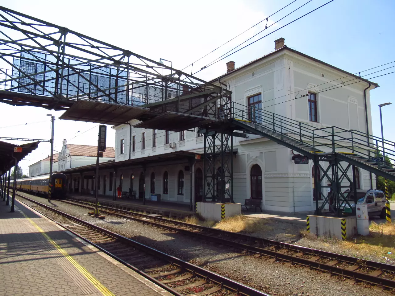 | Za peronem 4 jest stary dworzec,jest już co prawda trochę zarośnięty ale widać jeszcze ściany. Na dachu widać jeszcze starą wieżyczkę z której kiedyś było słychać dzwon kiedy przyjechał pociąg. A gdzie wejście? No wystarczy spytać mieszczan i jesteśmy (trzeba mówić po czesku). Wejście do dworca jest otwarte więc można wejść (jest co prawda trochę ciemno ale można wszystko zobaczyć). Jest tam 8 kas, poczekalnia, oraz sklepik (czynny). W nowym dworcu jest 16 kas, sklepiki i sklepy, poczekalnia oraz wyjście na peron. Nowy budynek ma już ok. 10 lat, a nawet więcej. Trzyma jak powinien. (info: Bernard, 2007-03-17). |