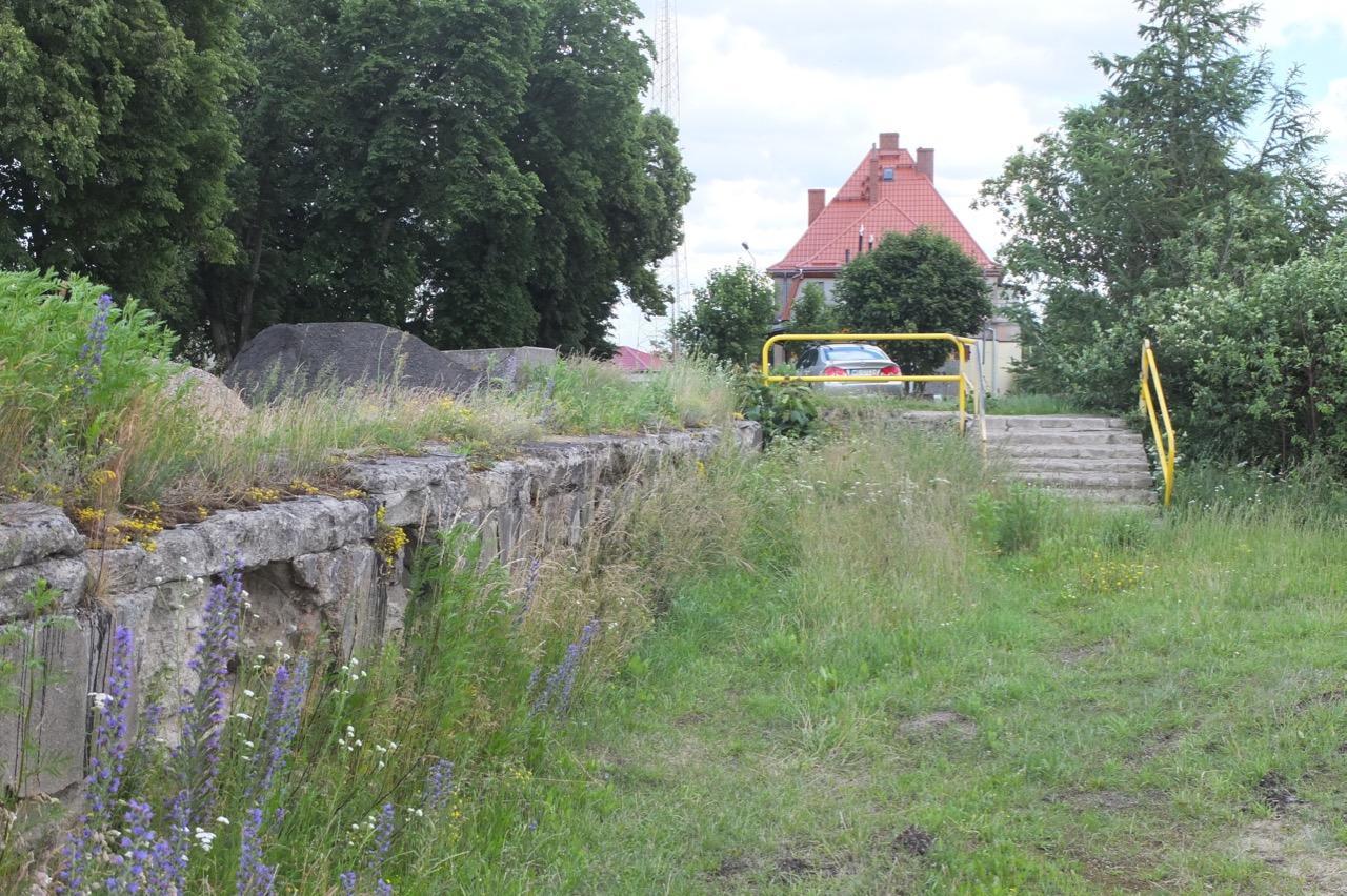 Polanów. Zachowana rampa. Po prawej budynki dworca.