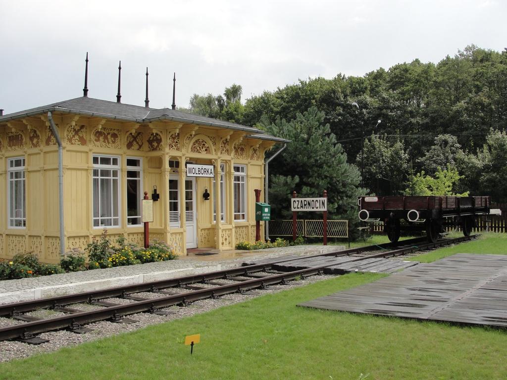 Odrestaurowany budynek dworca Wolbórka stojący na terenie Skansenu Rzeki Pilicy w okolicy Tomaszowa Mazowieckiego.