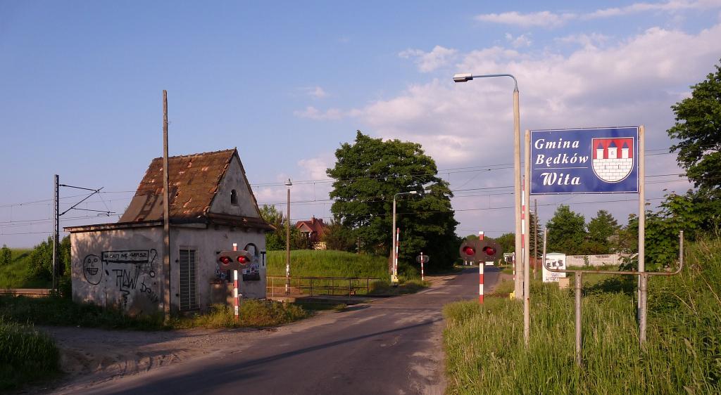 Przejazd kolejowy. W prawo Piotrków/Katowice, w lewo Koluszki/Warszawa.