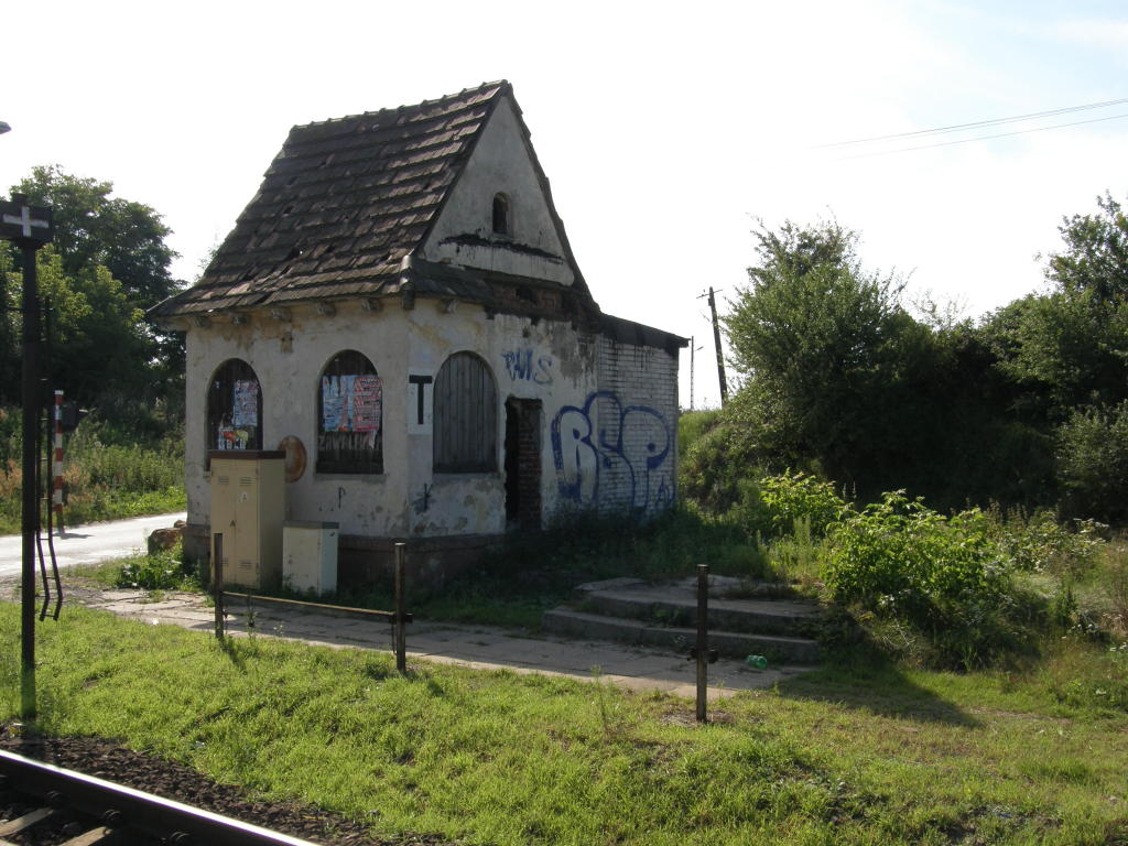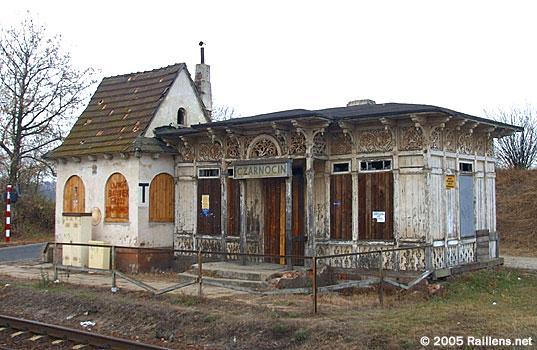 Czarnocin. Pamiętający lata świetności kolei warszawsko-wiedeńskiej drewniany budyneczek dworca popadł już w ostateczną ruinę, o czym świadczą szpecące napisy "budynek grozi zawaleniem".