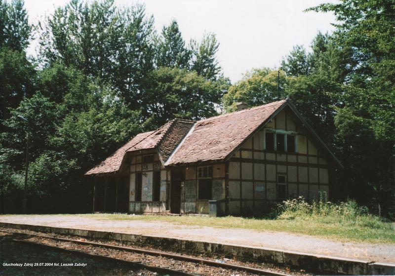 Głuchołazy Zdrój. Budynek stacyjny od strony torów. Zdjęcie zrobione 29.07.2004 a 31.07.2004 dostani raz przyjechał i wyjechał stąd pociąg relacji Nysa - Głuchołazy Zdrój - Nysa. Niestety dziś już nie ma budynku i też pociągi już nie jeżdżą.