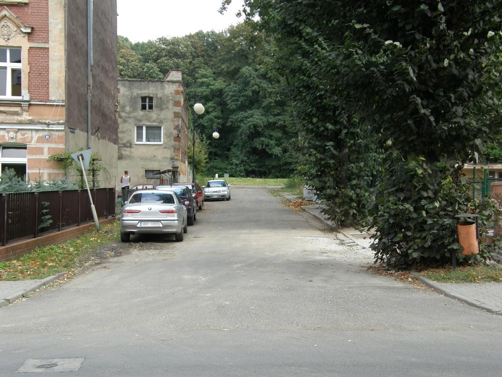 Ulica Henryka Brodatego prowadzi na peron. Widoczne miejsce po budynku dworcowym. W lewo Nysa, w prawo koniec linii. 8,6 km.