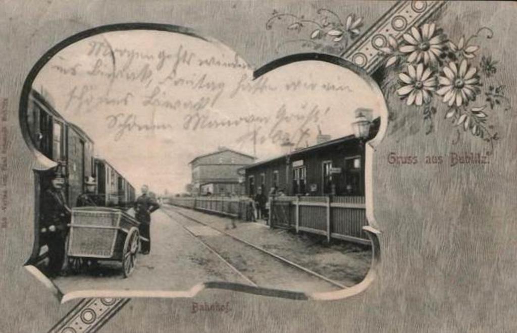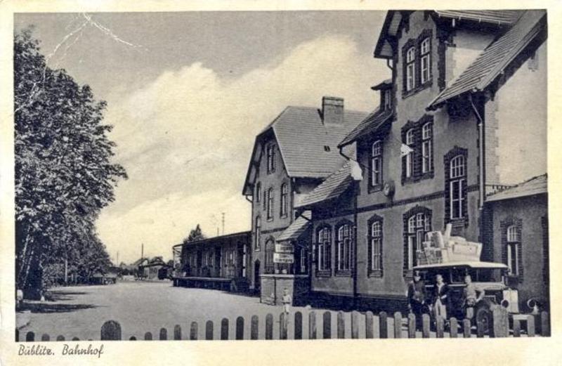 Prawdopodobnie ten drewniany budynek był pierwszym normalnotorowym dworcem w Bobolicach.W oddali widać dworzec wąskotorowy.