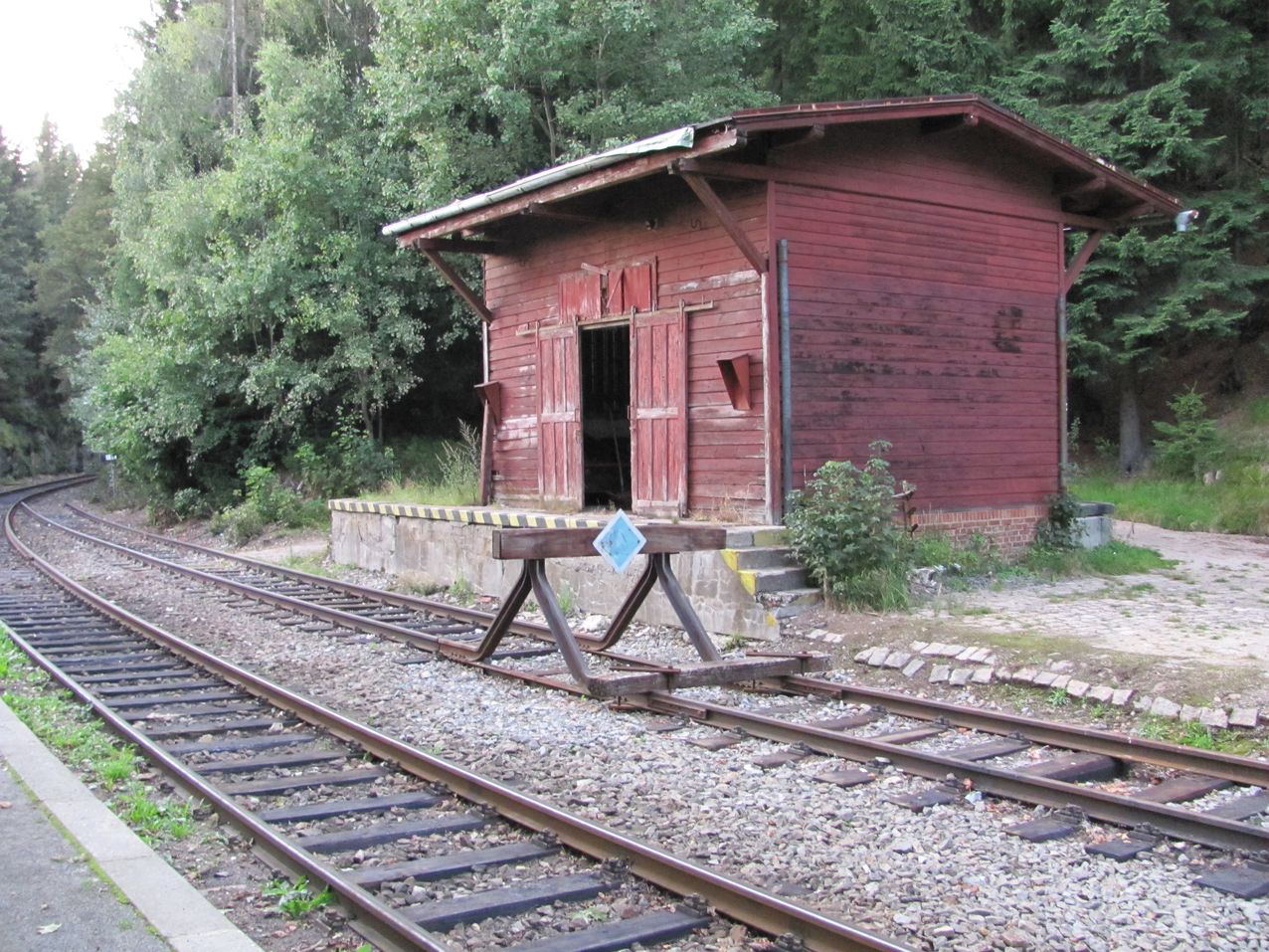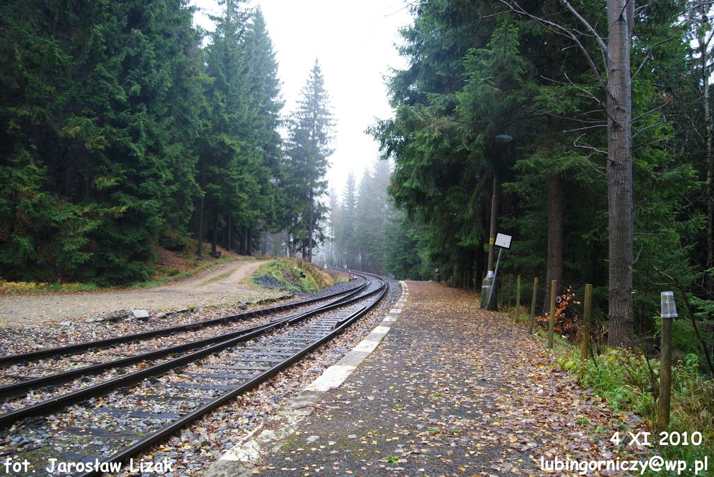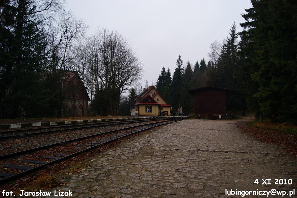 Widok z peronu stacyjnego na kozioł oporowy przed rampą. Tory na prawo prowadzą do Jakuszyc.
