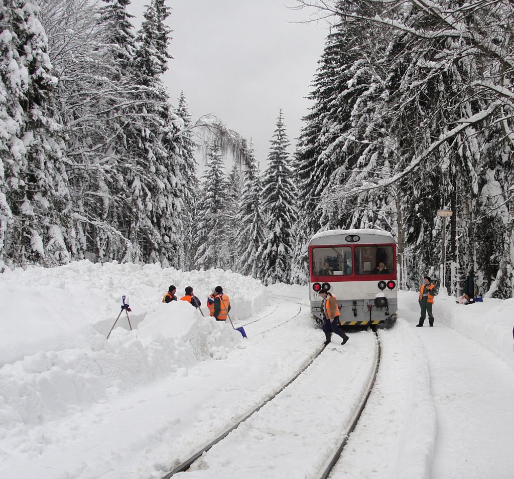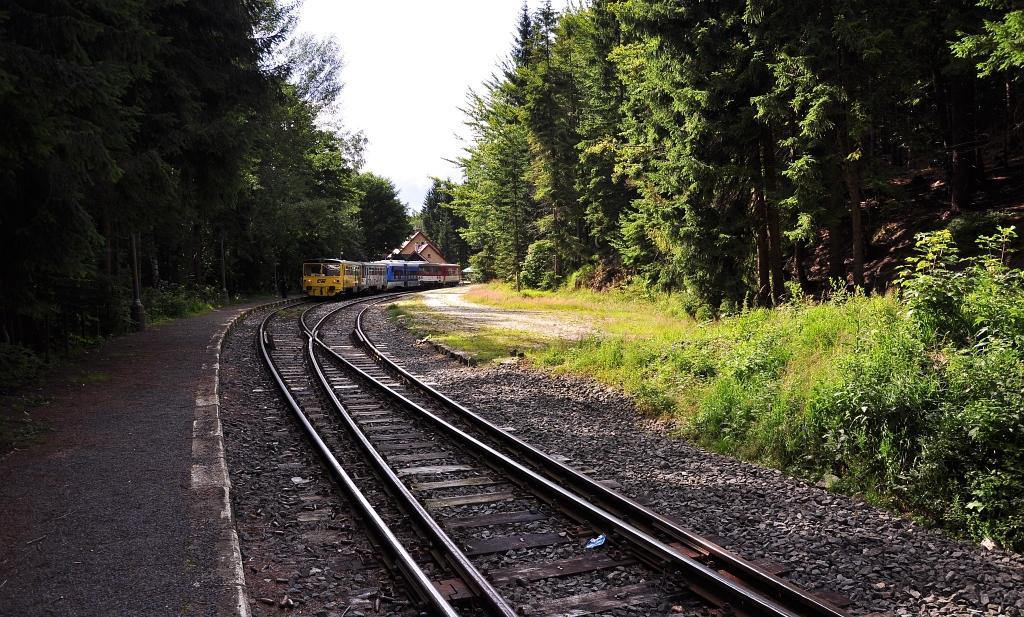 Podwójny zestaw spalinowy: 843 008 - 4 (wagon silnikowy) i 943 007 - 5 (wagon sterowniczy). Wjazd od strony Kořenova.