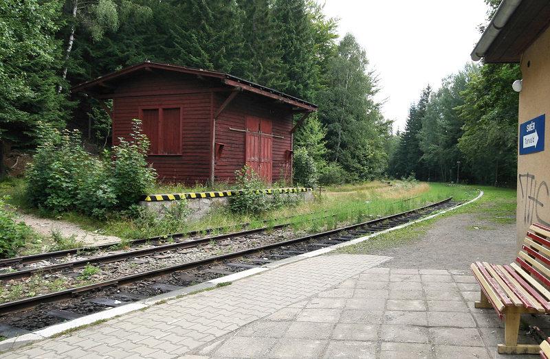 Na zdjęciu widać, w jaki sposób prowadzony jest ruch na stacji: pociągi z obu kierunków (z Tanvaldu i z Jakuszyc) przyjmowane są na ten sam tor, zresztą jedyny przy krawędzi także jedynego peronu. Po przejściu maszynisty na drugie czoło składy znów rozjeżdżają się. Według informacji obsługi pociągu planowana jest odbudowa brakującej zwrotnicy, co pozwoli na przyjmowanie pociągów na sąsiednie tory i na ewentualnie na oblot tradycyjnego skladu. Obecny plac ładunkowy byłby wówczas peronem nr 2.