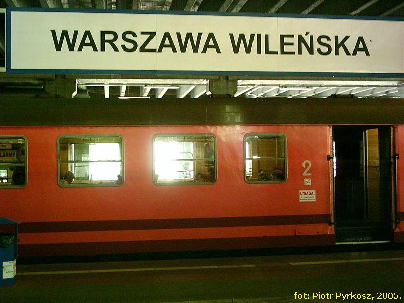 Peron na stacji Warszawa Wileńska. Z boku widoczny pociąg, który za chwile odjedzie do Małkini.