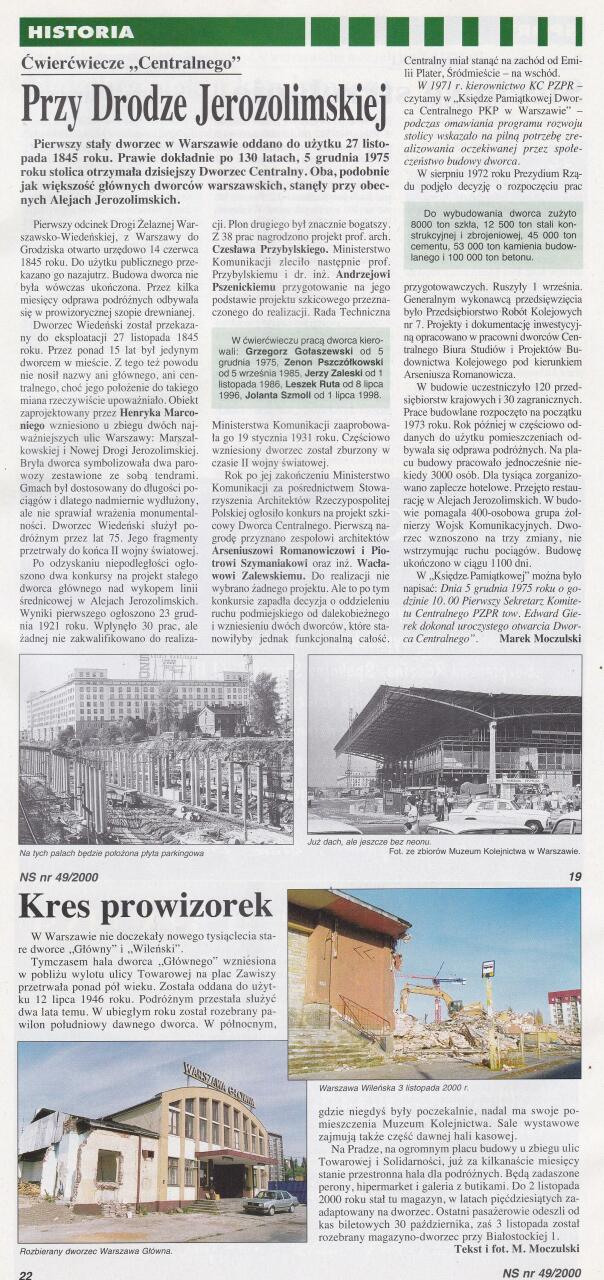 Skan artykułów z Nowych Sygnałów nr 49/00 o stacjach Warszawa Centralna, Główna i Wileńska.