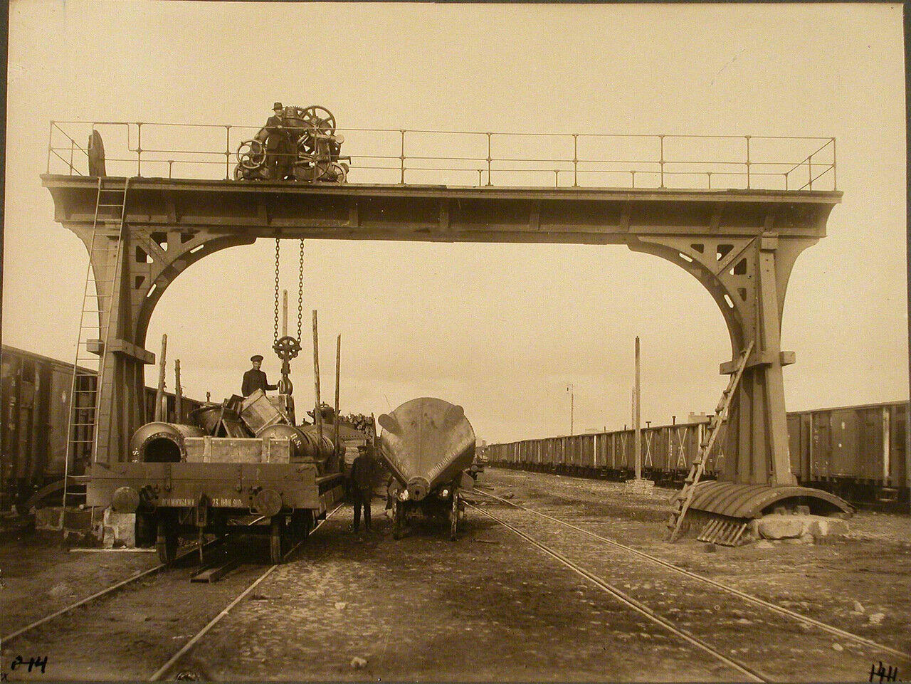 Załadunek elementów stalowych na wagony, przy użyciu bramownicy przeładunkowej na stacji Warszawa Petersburska Towarowa.