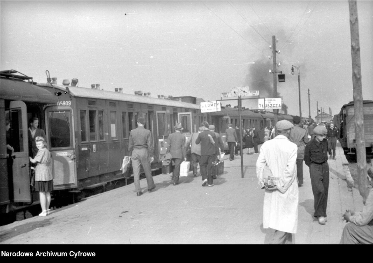 Peron na Wileńskiej - widoczne składy do Łomży i do Tłuszcza. Zdjęcie z WAF - NAC.