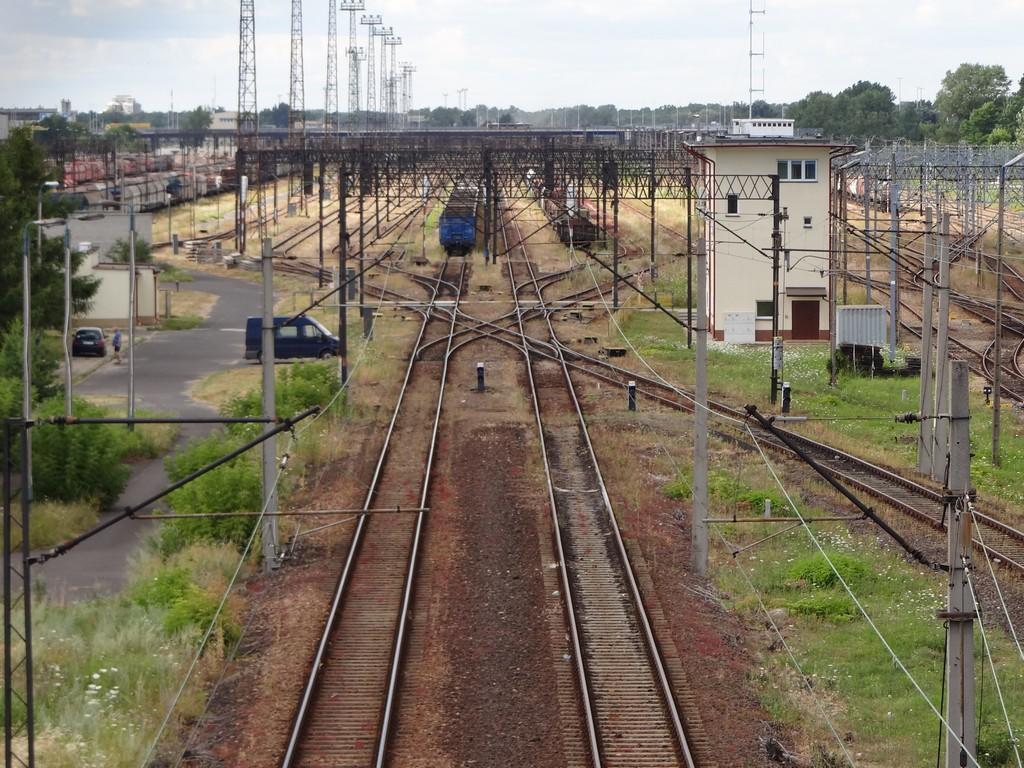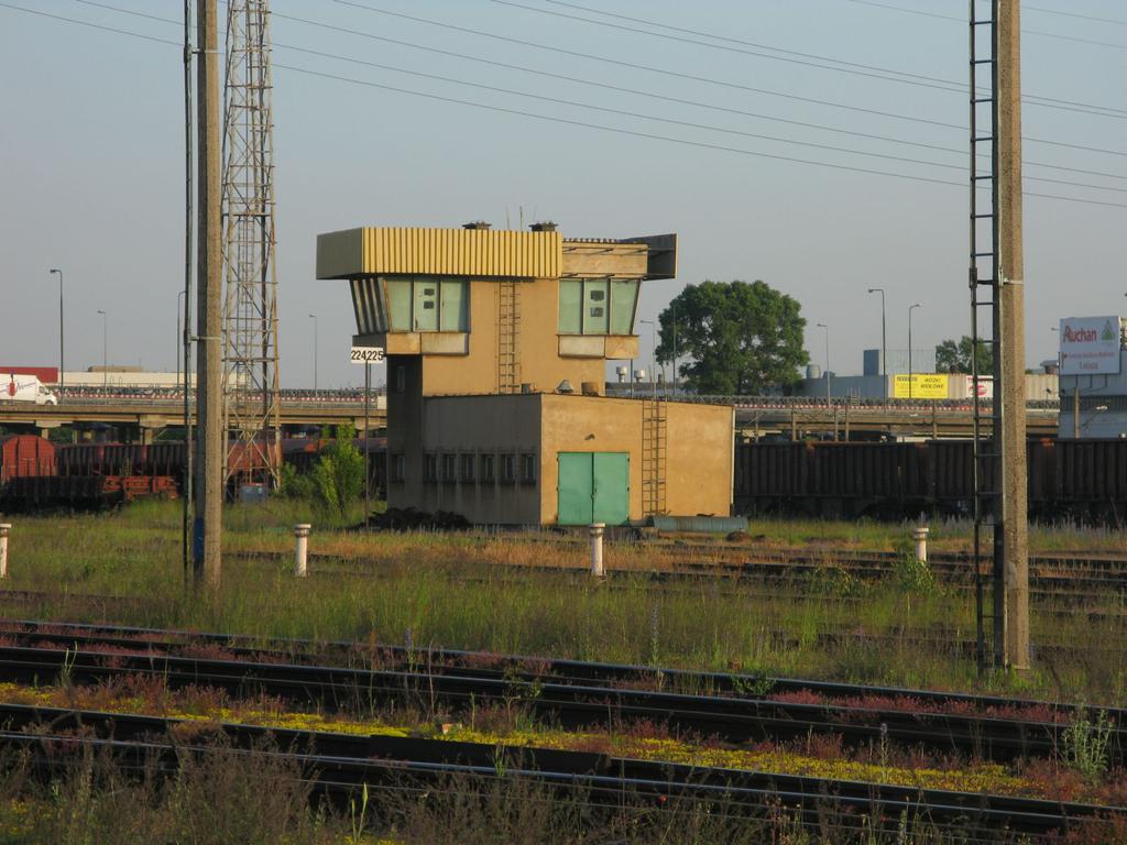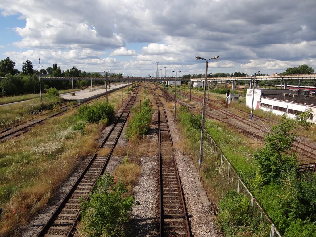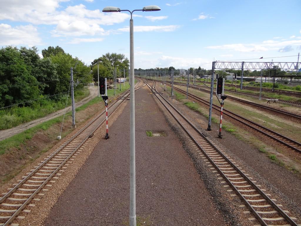 Od lewej jednotorowa linia Warszawa Praga R26 - Warszawa Praga R106 modelowo służąca do wyjazdów z grupy odjazdowej wschodniej i grupy odjazdowej zachodniej w kierunku Warszawy Gdańskiej, jednotorowa linia Warszawa Praga R33 - Warszawa Praga R97 biegnącą przez całą część towarową stacji (6,5 km długości linii) na tym odcinku modelowo służąca do wyjazdów z grupy odjazdowej wschodniej i grupy odjazdowej zachodniej w kierunku Warszawy Gdańskiej i Warszawy Wschodniej, tor komunikacyjny służący do wjazdów z kierunku Warszawy Gdańskiej i Warszawy Wschodniej na grupę odjazdową wschodnią. Po prawej nastawnia dysponująca WPT. Na wprost grupa odjazdowa wschodnia (część południowa). Od lewej jednotorowa linia Warszawa Praga R33 - Warszawa Praga R97 biegnącą przez całą część towarową stacji (6,5 km długości linii) na tym odcinku modelowo służąca do przejazdów lokomotyw luzem do składów towarowych na grupie odjazdowej wschodniej i grupie odjazdowej zachodniej, siedem torów odjazdowych, tor odstawczy lokomotyw. Widok w kierunku Legionowa. 10,0 km.