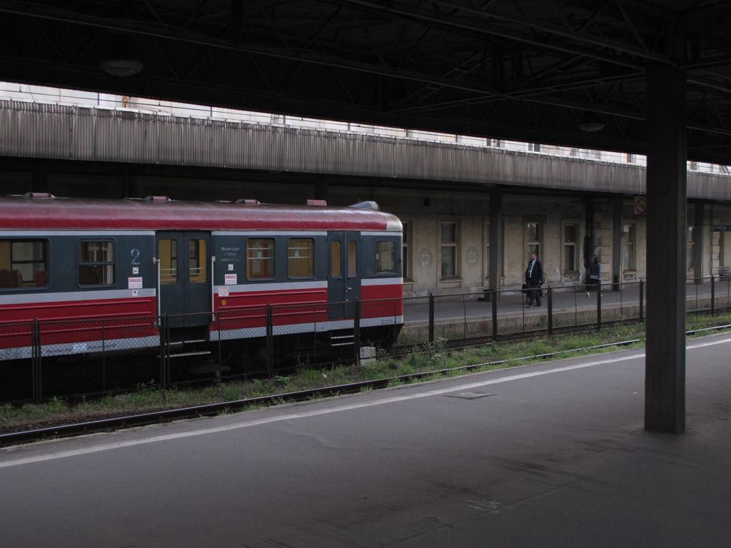 Fragment dworca i peronu 1, widok z pociągu stojącego przy peronie 2.