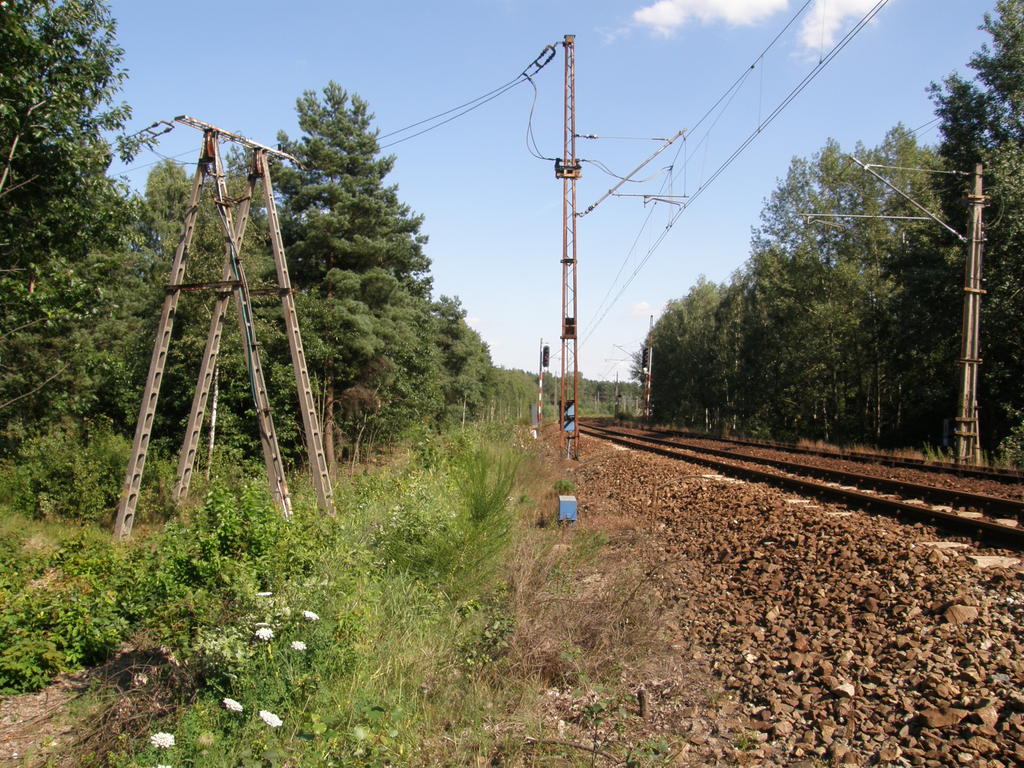 Zasilacz przy podstacji trakcyjnej Mikołajów. Widok w kierunku Tomaszowa Mazowieckiego. 33,4 km.