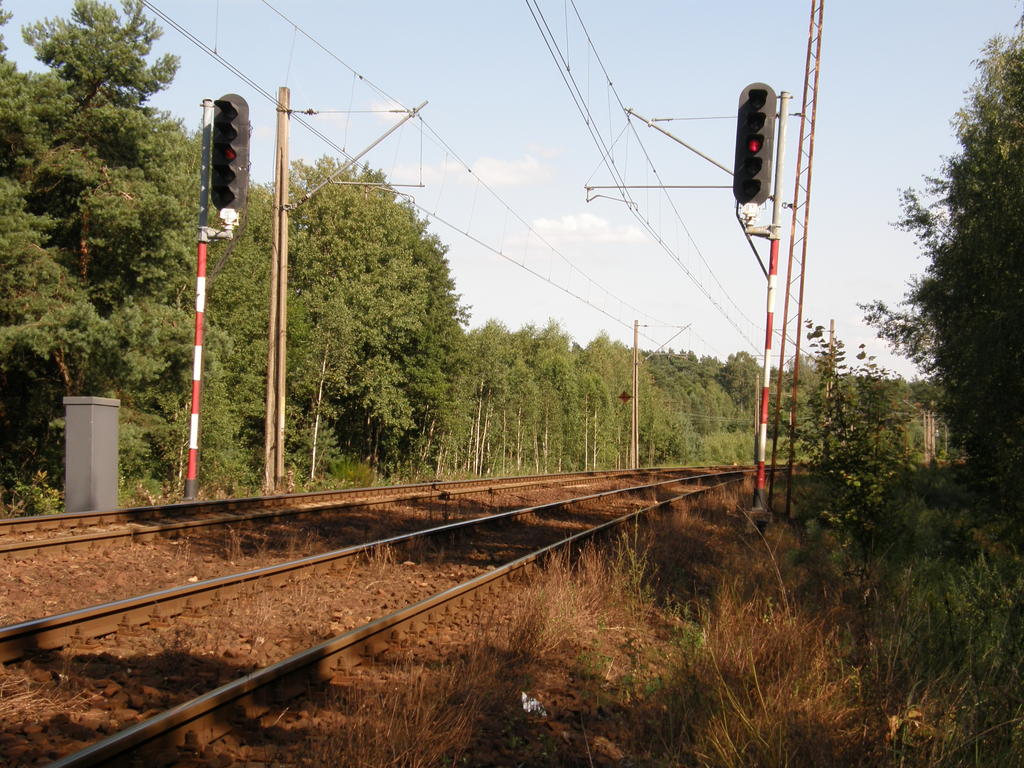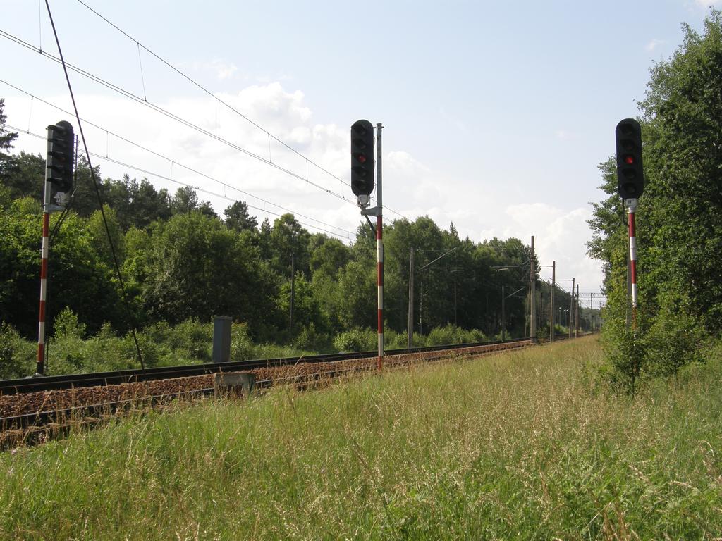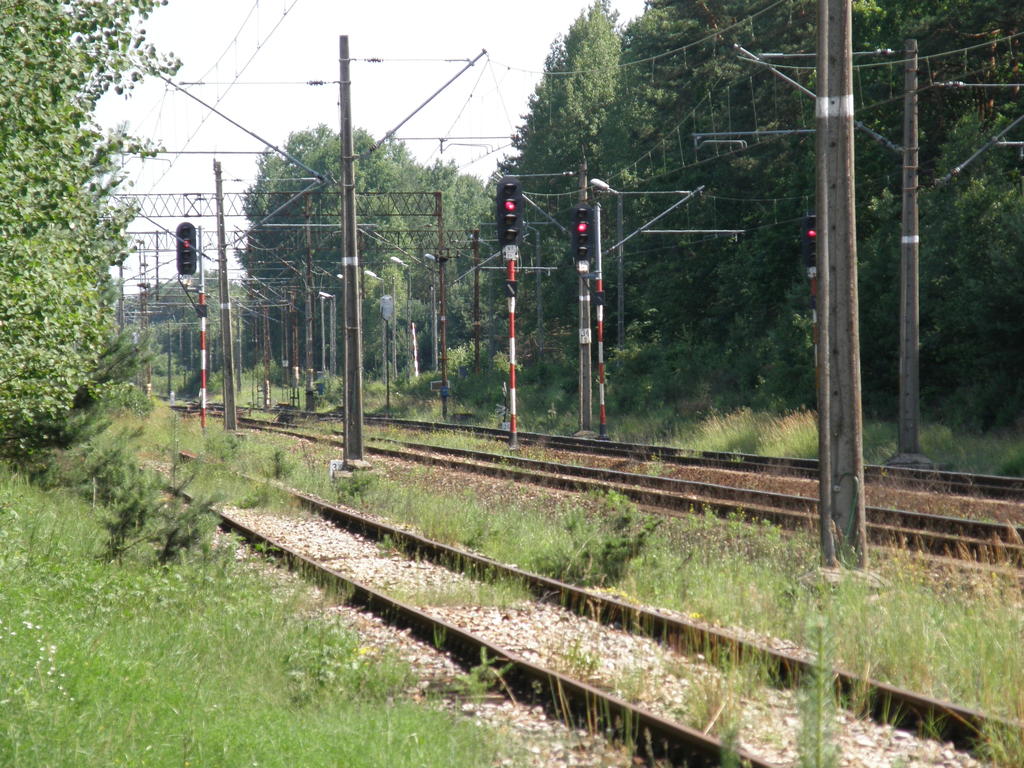 Semafory wjazdowe stacji Mikołajów od strony Tomaszowa Mazowieckiego. Widok w kierunku Tomaszowa Mazowieckiego. 35,4 km.