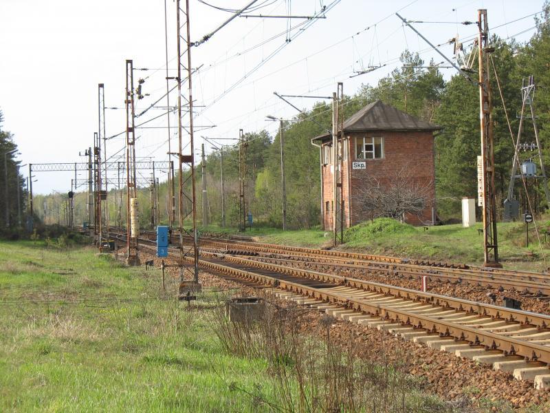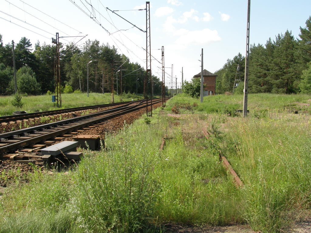 Południowa głowica rozjazdowa. Była nastawnia, dziś pskp. Przy torze nr 2 nieczynny peron. Widok w kierunku Łodzi. 35,0 km.