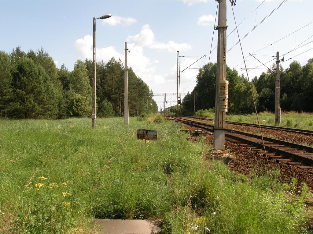 Południowa głowica rozjazdowa. Była nastawnia, dziś pskp. Żeberko ochronne linii Mikołajów - Regny - Koluszki. Widok w kierunku Łodzi. 35,0 km.