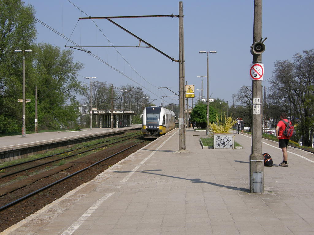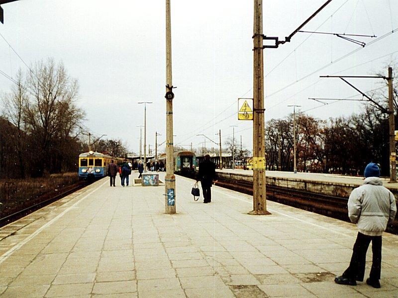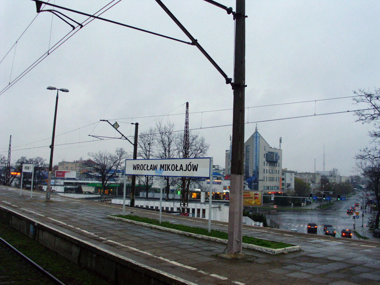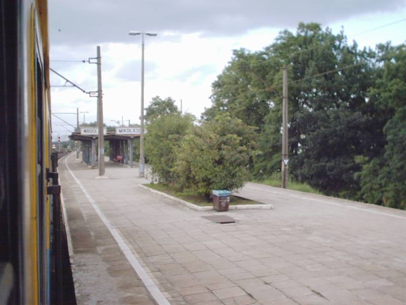 Wrocław Mikołajów, perony, po lewej pociąg z Rawicza (EN57–1131ra), po prawej do Poznania.