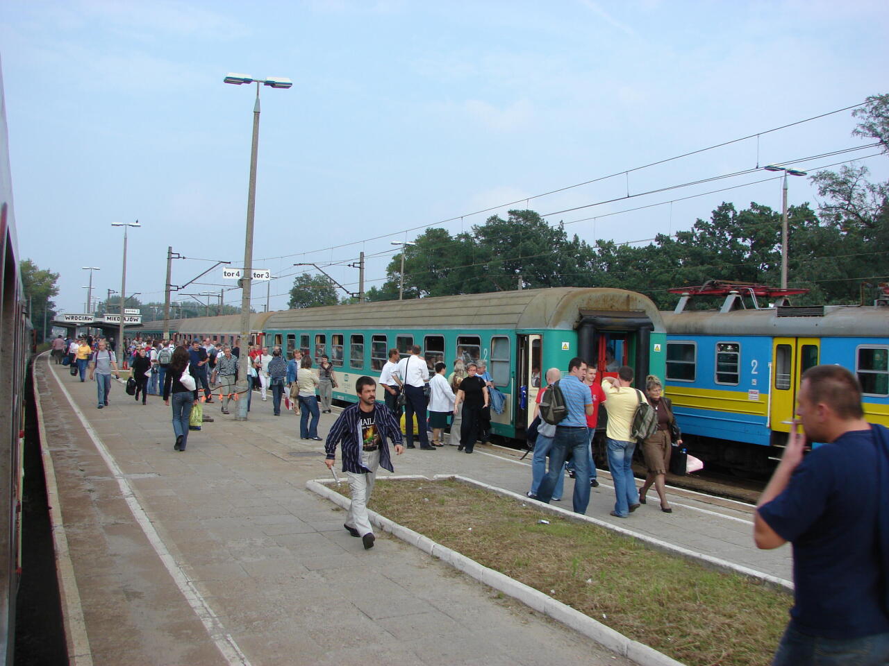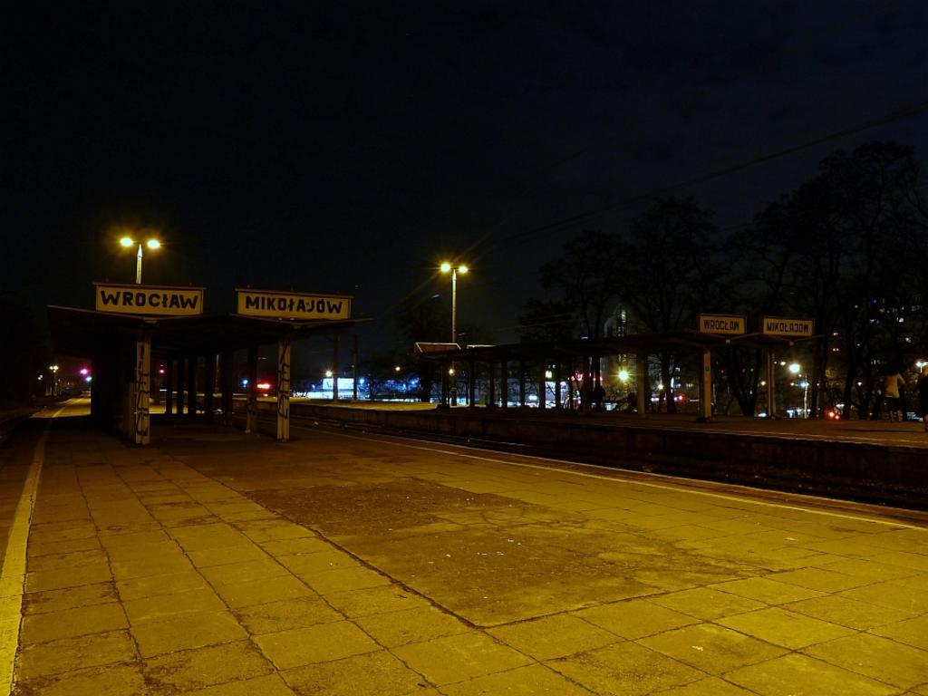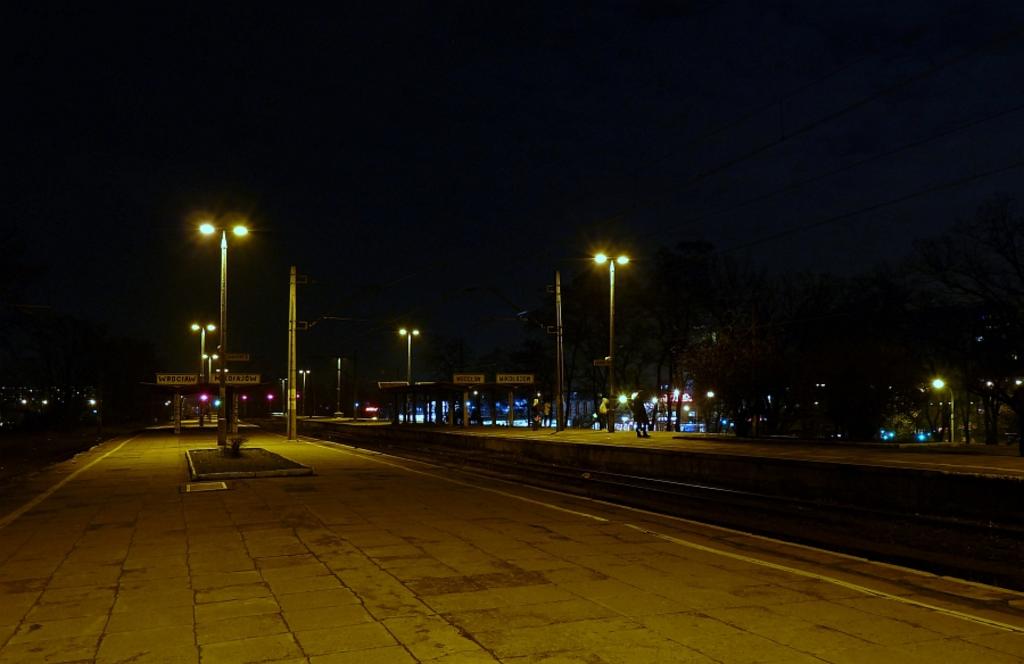 Widok w stronę stacji Wrocław Nadodrze i Wrocław Osobowice. Po lewej stronie widoczny budynek dworca, perony i stojący skład ezt EN57-646 do Kluczborka. Na drugim peronie tłum pasażerów oczekuje na pociąg.