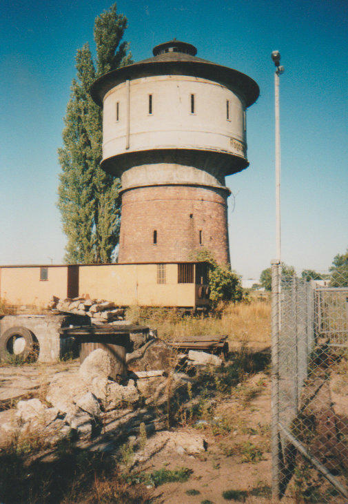 Rogoźno Wielkopolskie. Kolejowa wieża wodna nr 1 w sierpniu 1999 r., w lewo Poznań w prawo Piła.