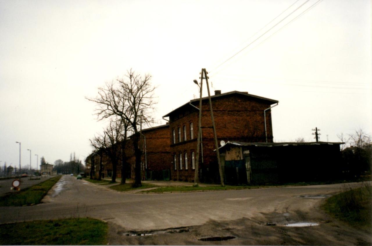 Widok na kolejowe budynki mieszkalne przy ul. Dworcowej od strony wjazdów z Obornik Wielkopolskich i Bzowo Goraja.