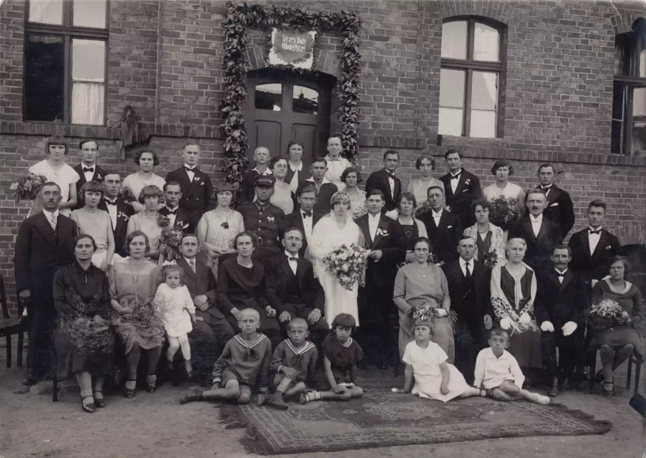 Pierwsza zabawa Towarzystwa Kolejarzy w Rogoźnie. Kopia fotografii uzyskana dzięki uprzejmości Haliny Marcinkowskiej. Prawa autorskie do fotografii zapewne wygasły.