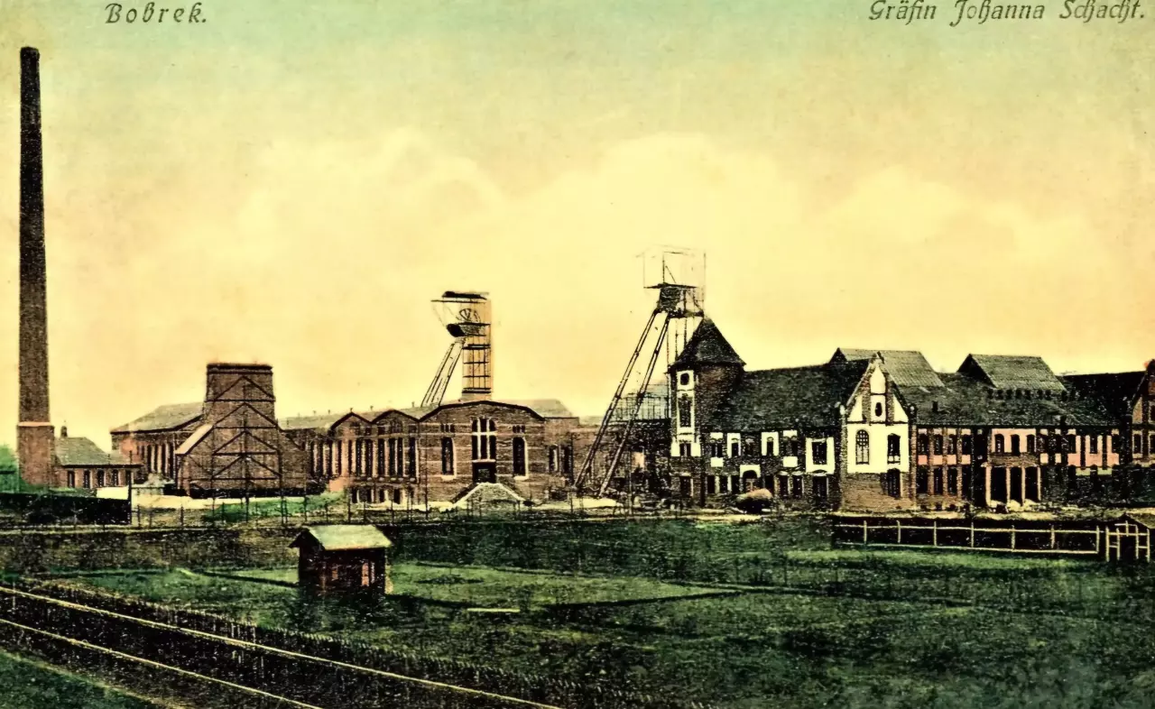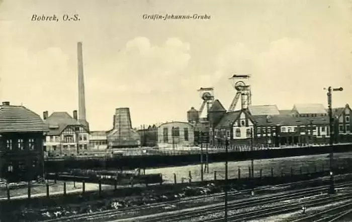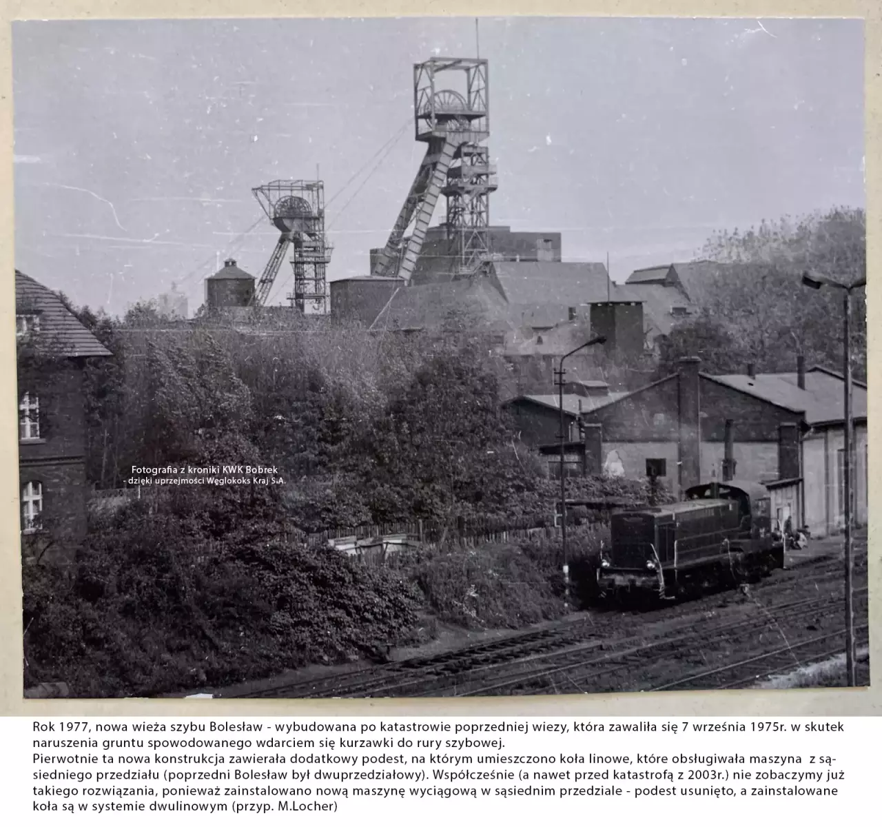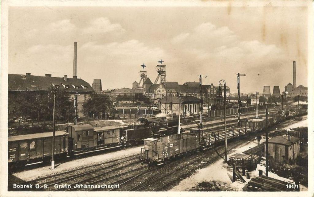 Kopalnia Bobrek widziana ze stacji Bytom Bobrek. Na pierwszym planie jeden z torów prowadzących ze stacji Bytom. Wzdłuż zabudowy kopalni przebiegają tory do stacji Bytom Karb (w prawo). Widok w kierunku północno-zachodnim.