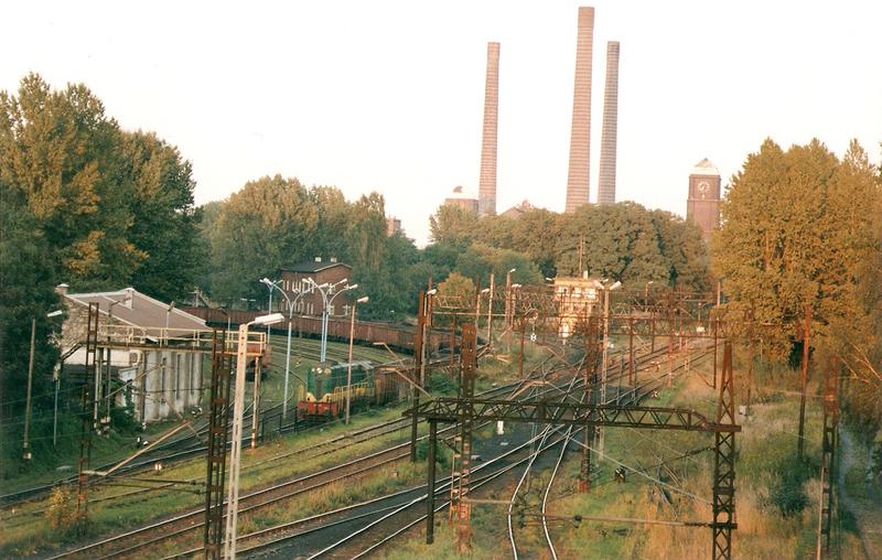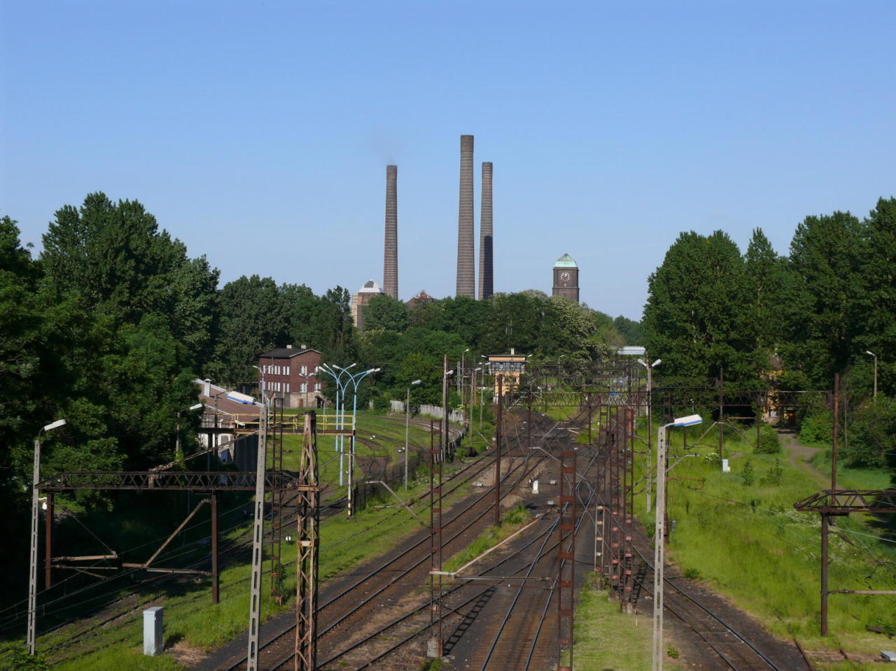 Widok na teren stacji kolejowej od strony wjazdu Zabrza Biskupic. W tle, z prawej Elektrociepłownia Szombierki, z lewej Kopalnia Bobrek. Poniżej elektrociepłowni znajdują się perony, z prawej, poza kadrem - dworzec. Kierunek południowo-zachodni.
