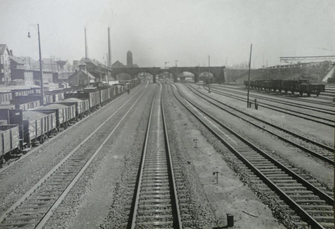 Widok na perony i budynek dworca od strony wjazdu ze stacji Bytom. W tle wiadukt w ciągu ul. Konstytucji, jeszcze z ceglaną, łukową konstrukcją. W tle, z prawej wysoki komin karbidowni, z lewej zabudowa Huty Bobrek. Kierunek zachodni.