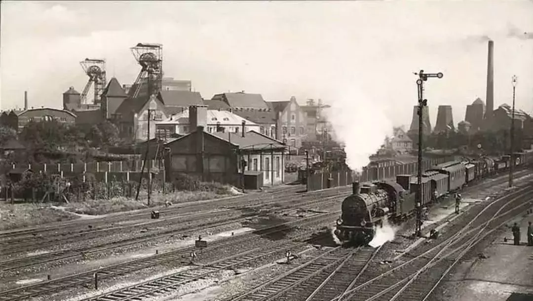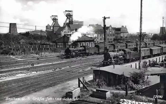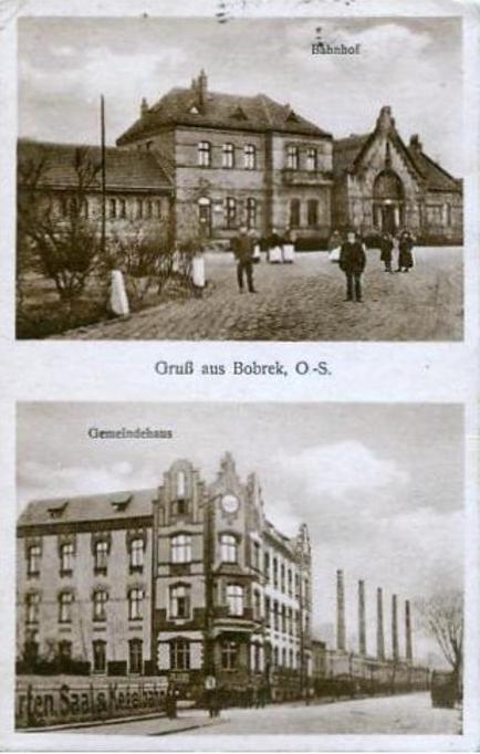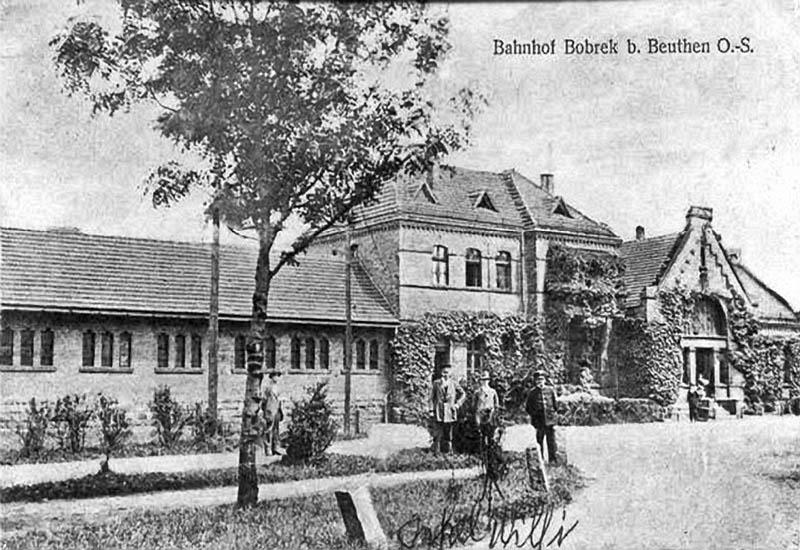 Huta Bobrek/Beuthen Bobrek - w tle Julienhütte, późniejsza Huta Bobrek. W centrum kadru wiadukt w ciągu ul. Konstytucji, który obecnie ma inkszą konstrukcję. W lewo perony, w prawo wyjazd na Zabrze Biskupice.