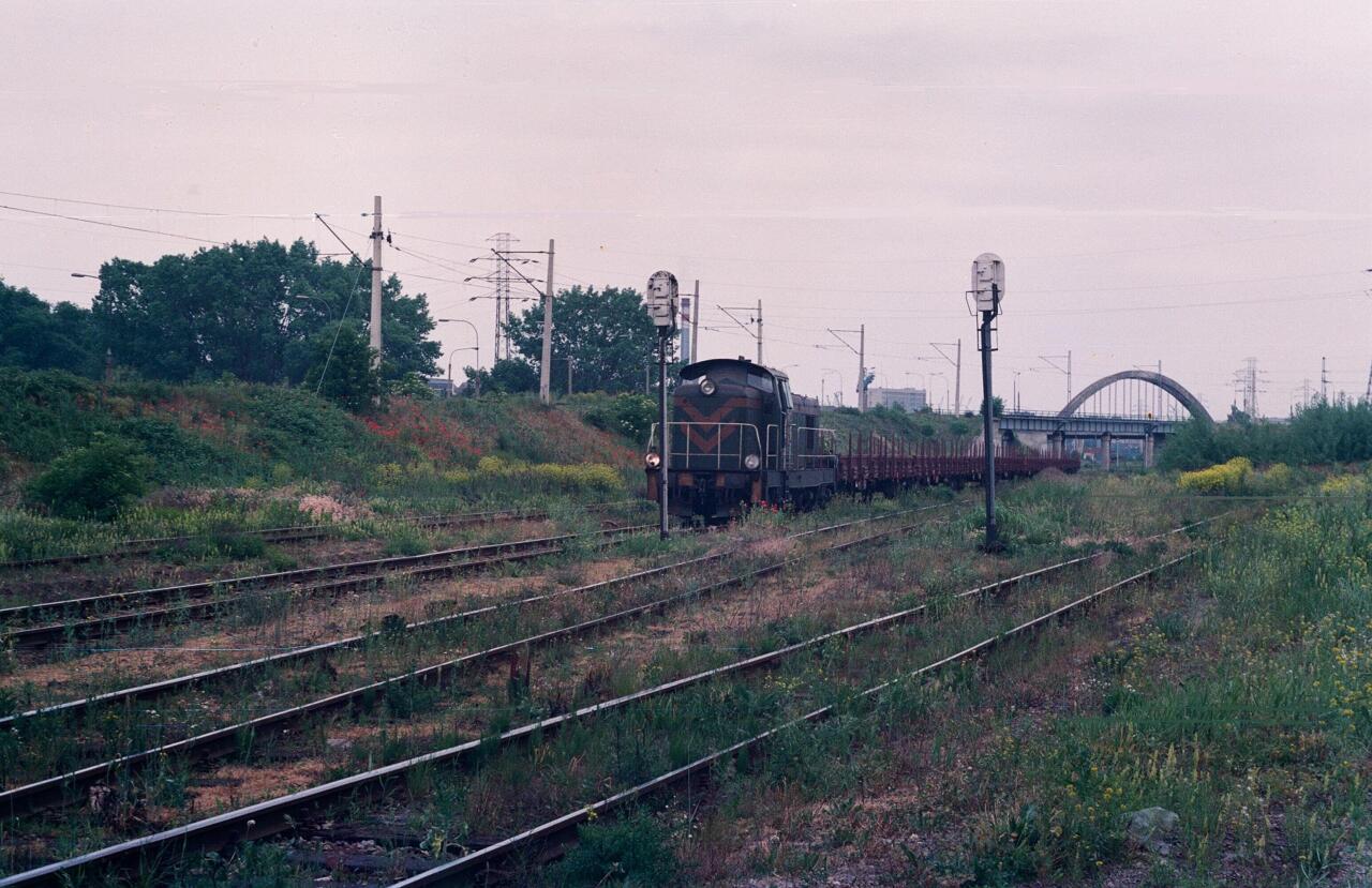 Stacja Gdynia Port GPC - lokomotywa SM42 ze składem wagonów platform serii Res na torze nr 122, łączącym okręg nastawczy GPC z posterunkami P13, P15. Z lewej strony, na nasypie tor nr 39 - zelektryfikowany (przechodzący na zdjęciu wiaduktem na prawą stronę), który łączył posterunki GPA, GPB z posterunkami GPD, GPE, GPF z pominięciem głowicy rozjazdowej, sterowanej z nastawni dysponującej GPC. Tor 39 służył przede wszystkim do kierowania lokomotywami manewrowymi składów pociągów z przybycia na górkę rozrządową, zlokalizowaną na posterunku Gdynia Port GPD celem wykonania rozrządu. Na dalszym planie wiadukt (łukowy) ul. Janka Wiśniewskiego. Widok w kierunku posterunków P13, P15, tor 39 (na nasypie z lewej) i tor pierwszy z prawej - widok w kierunku stacji Gdynia Główna Osobowa (Nowa Wieś Wielka).