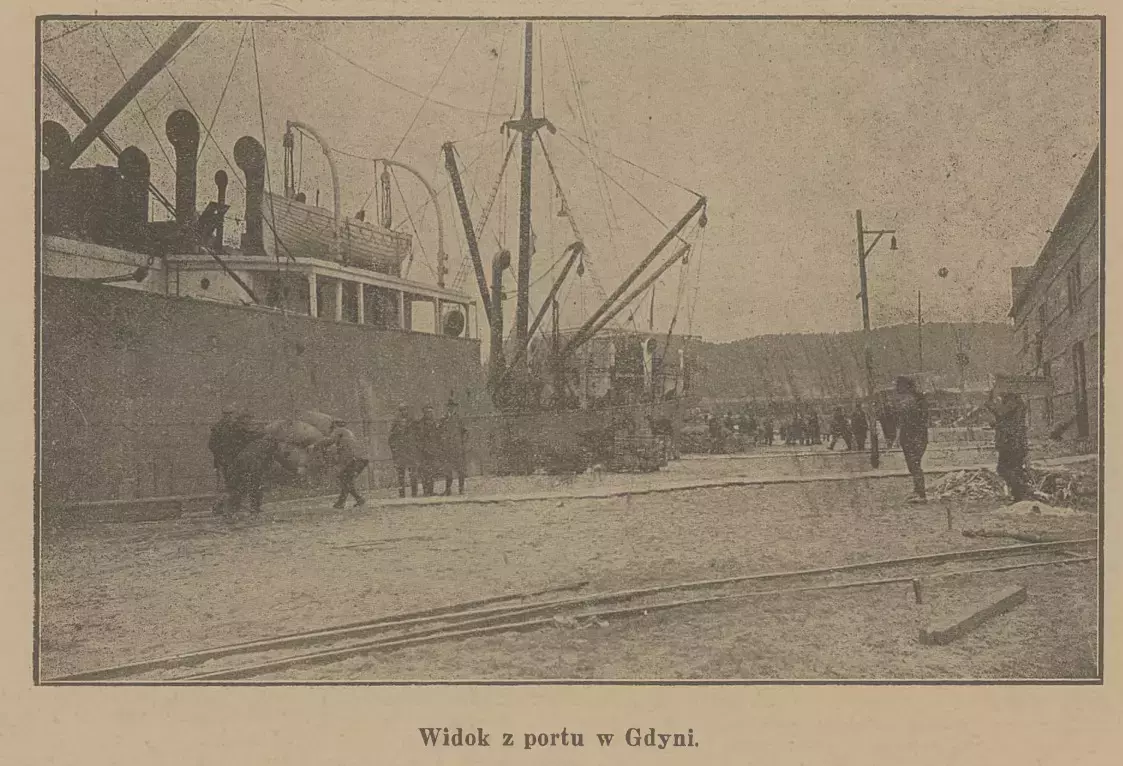 Fragment nabrzeża portu w Gdyni w jego wczesnym okresie - 1928 - pokazuje również obecność lokalnej kolei wąskotorowej, której tor i rozjazd widoczny jest na pierwszym planie.