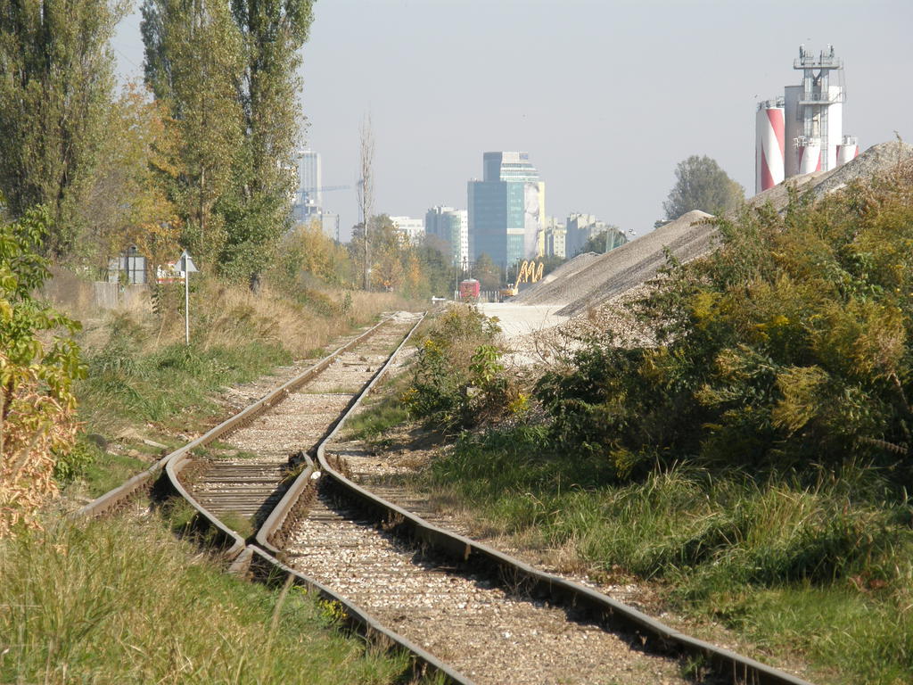 Przejście piesze pomiędzy ulicami Potrzebną a Gniewkowską i Przyce. Bocznica P.H.U. Euro-Trans Przesypownia Odolany. Widok w kierunku Warszawy Głównej Towarowej. 2,6 km.