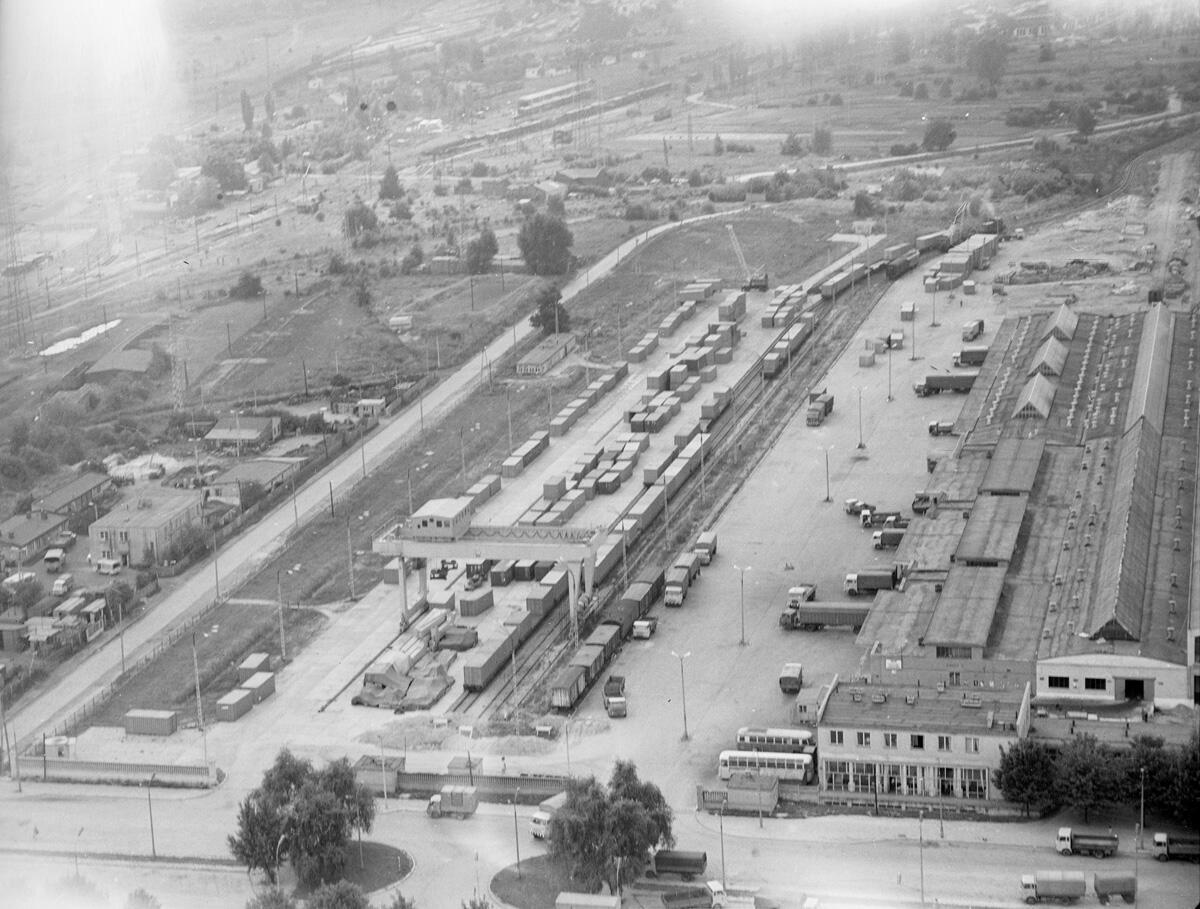 Ogólny widok bazy przeładunkowej stacji Warszawa Główna Towarowa przy ulicy Ordona. Po lewej ulica Gniewkowska.