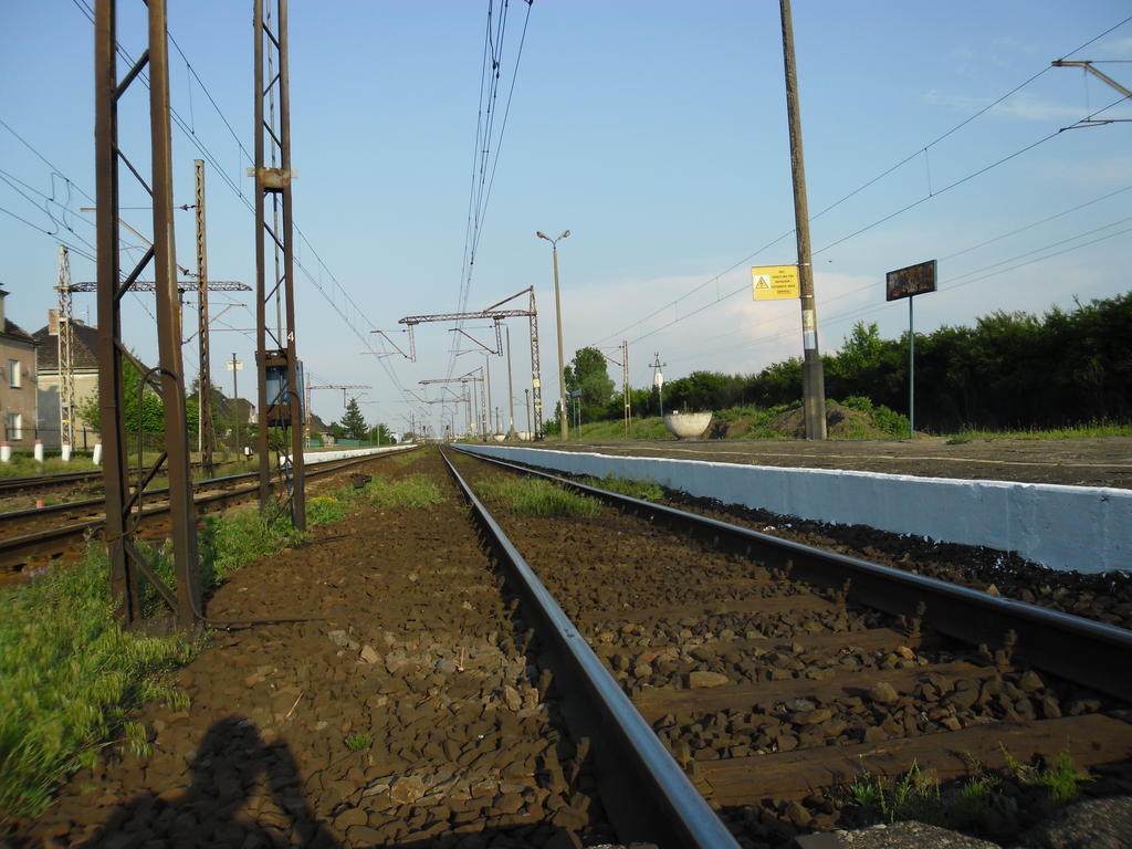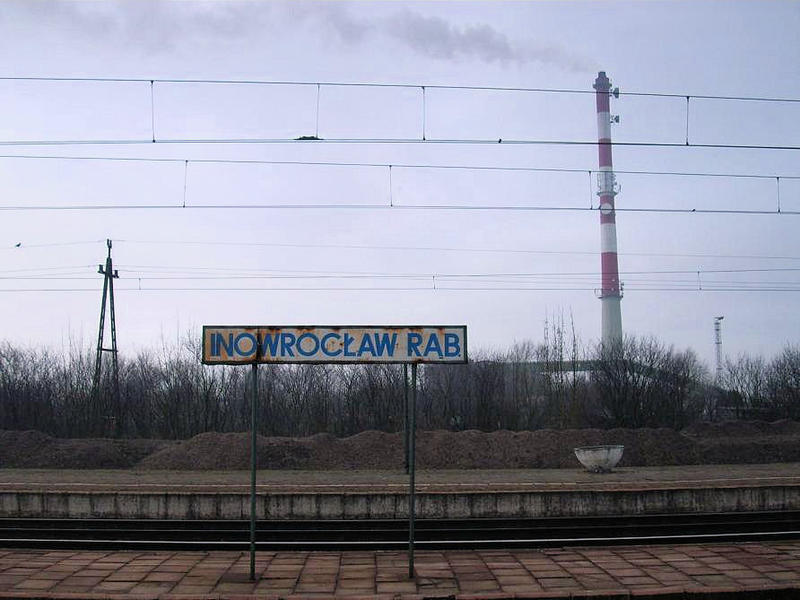 Inowrocław Rąbinek. Po prawej stronie znajduje się WC peronowe, w oddali nastawnia o bliżej mi nie znanej nazwie. Na przejeździe w lewo dojazd do Z.E.C. w Inowrocławiu (Widoczne zapory otwierają się tylko, gdy podjedzie do nich pojazd. Ruch pociągów jest tak intensywny, że nie nie ma sensu ich co chwile podnosić i opuszczać).