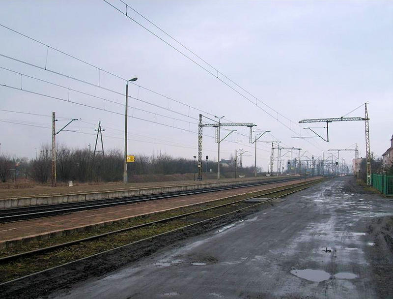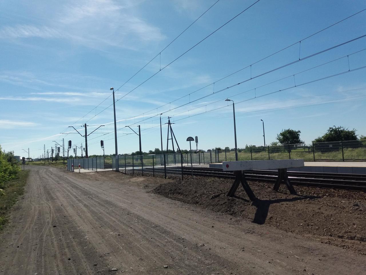 Peron 1. Bardzo przemysłowy widok na peron 1 widziany z gruntowej drogi dojazdowej do stacji.