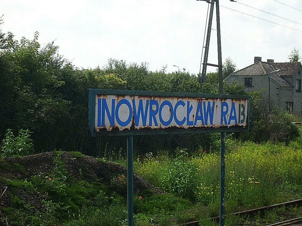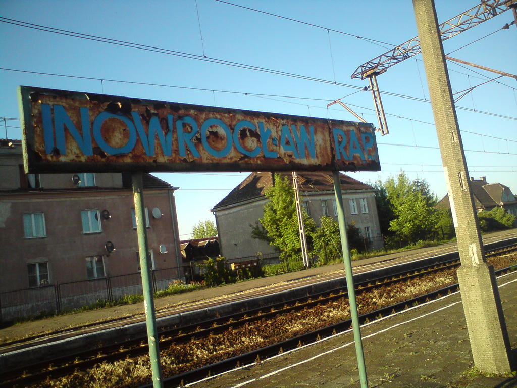 Kolejowe budynki mieszkalne (ul. Budowlana 62, 60 i 58). Obiekty widoczne od strony torów. Tablica z nazwą stacji. W lewo Inowrocław (stacja kolejowa) i Pakość/Drawski Młyn, w prawo Piotrków Kujawski/Zduńska Wola Karsznice i Kruszwica/Mogilno.