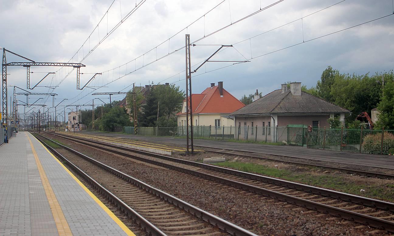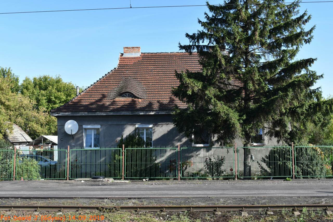Kolejowy budynek mieszkalny (ul. Budowlana 50) widoczny od strony torów. W lewo Inowrocław (stacja kolejowa) i Pakość/Drawski Młyn, w prawo Piotrków Kujawski/Zduńska Wola Karsznice i Kruszwica/Mogilno.
