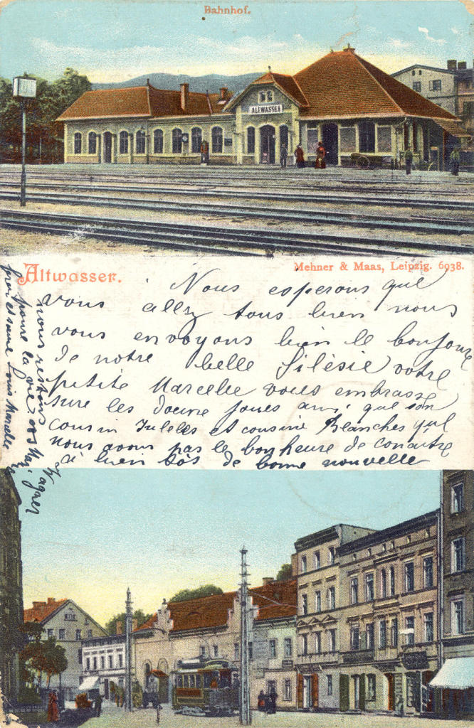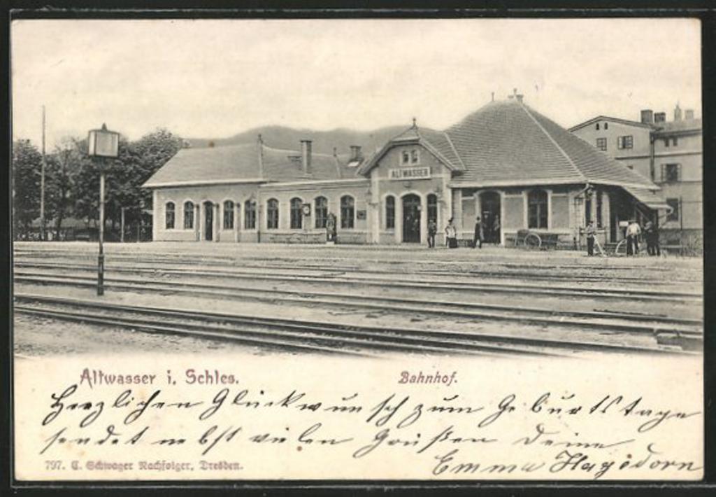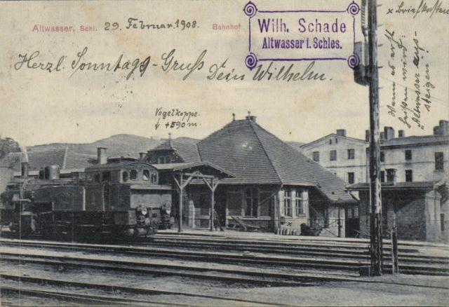 Wałbrzych Miasto - widok na budynek dworca od strony zachodniej przed budową peronu wyspowego. Pocztówka wysłana w 1904r.